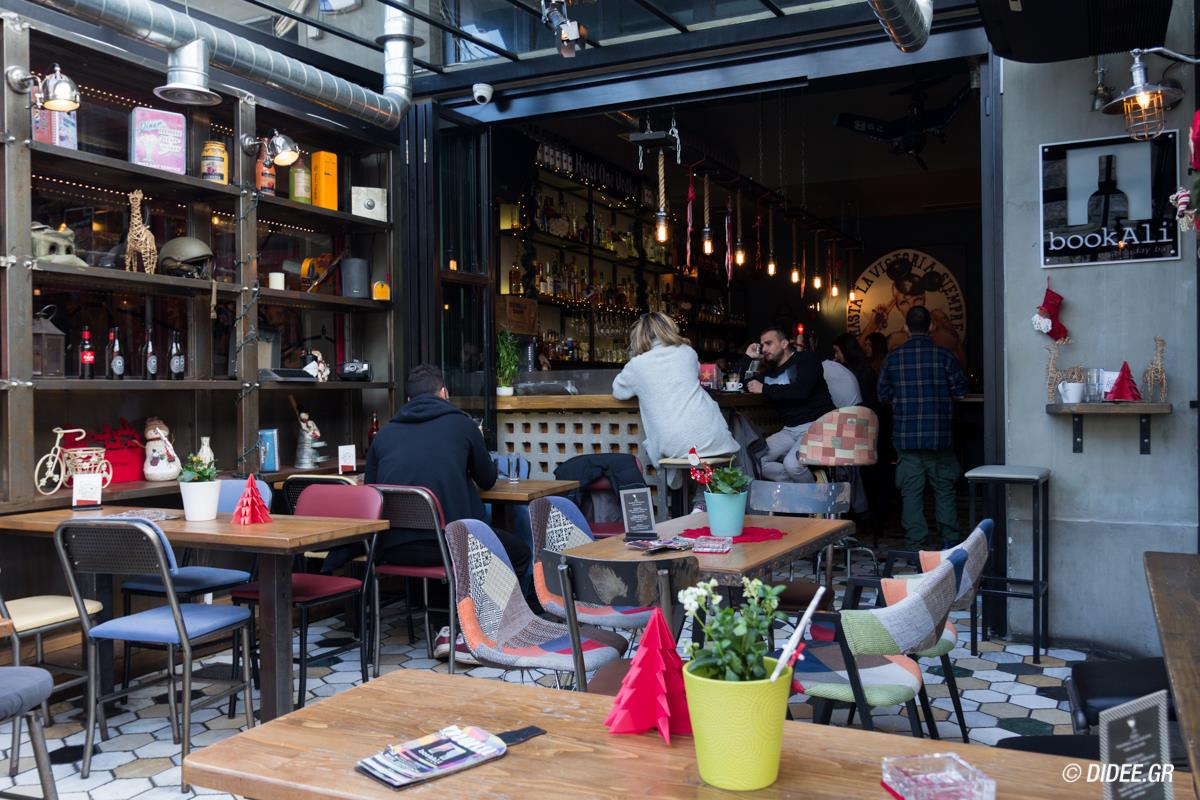 Σε έναν χώρο pet friendly, μια ανάσα κι εδώ απ’ το μετρό, χωρίς φορτωμένη διακόσμηση (ένα ατόπημα στο οποίο υποπίπτουν, δυστυχώς, πολλά μαγαζιά) με μόνο λίγες industrial λεπτομέρειες, το bookAli θέλει να φτιάξει μια ατμόσφαιρα όσο πιο χαρούμενη και φωτεινή γίνεται. Μπορούμε να πάμε από νωρίς, για καφεδάκι και γλυκό, αλλά με το που πέσει ο ήλιος και σταματά να βλέπει ο θεός, παραγγέλνουμε το ένα κοκτέιλ μετά το άλλο. Ξεχωρίσαμε το Give me poison, με μαστίχα, βότκα και πουρέ φράουλας. Οι τιμές για τα κοκτέιλ ξεκινούν από τα 8€.