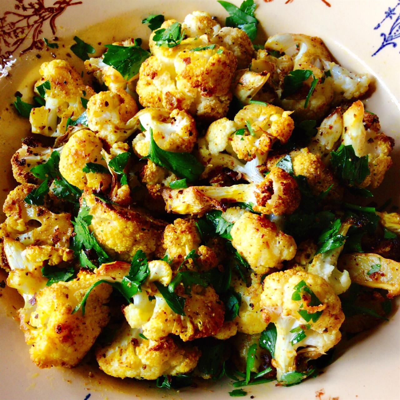 Για 4 άτομα ως συνοδευτικό. Προθερμαίνουμε τον φούρνο στους 180ο C στη λειτουργία του αέρα. Πλένουμε δύο μικρά κουνουπίδια ή ένα μεγάλο, αφαιρούμε τα φύλλα και το κάτω σκληρό μέρος των κοτσανιών και χωρίζουμε τα “μπουκετάκια”. Τα αραδιάζουμε στη λαμαρίνα του φούρνου που έχουμε στρώσει με αντικολλητικό χαρτί, τα αλείφουμε με λίγο έξτρα παρθένο ελαιόλαδο (όχι παραπάνω από 2 κ.σ.) και τα πασπαλίζουμε με χοντρό θαλασσινό αλάτι, χοντροτριμμένο μαύρο πιπέρι ή ποικιλία πιπεριών, κύμινο, κουρκουμά, καπνιστή πάπρικα και λίγο μπούκοβο (βλ. tips). Τα ψήνουμε για περίπου 25΄-30΄, μέχρι τα μπουκετάκια του κουνουπιδιού να «αρπάξουν» κατά τόπους και να τρυπιούνται, παραμένοντας όμως σχετικά τραγανά. Πασπαλίζουμε με ψιλοκομμένο μαϊντανό και σερβίρουμε χλιαρά ή σε θερμοκρασία δωματίου.