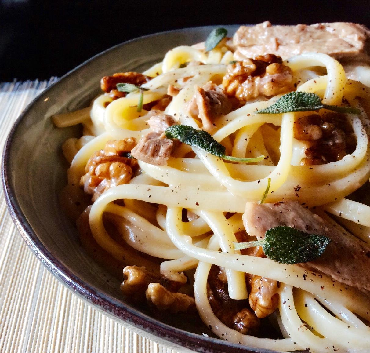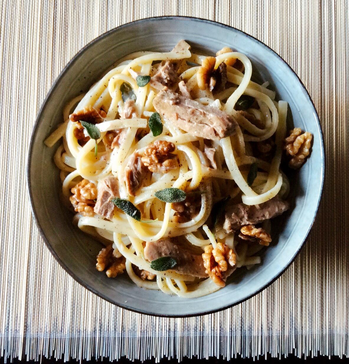 Για 3-4 άτομα. Όπως πάντα, ξεκινάμε με το να βάλουμε να βράσει άφθονο νερό στην κατσαρόλα. Αλάτι βάζουμε μόλις πάρει βράση για να κερδίσουμε χρόνο, αφού είναι γνωστό ότι αν το βάλουμε από την αρχή, ο βρασμός θα καθυστερήσει. Περιμένοντας να βράσει το νερό καβουρδίζουμε χωρίς λιπαρή ουσία 100 γρ. καρυδόψιχα (ολόκληρη ή χοντροσπασμένη) και την αφήνουμε στην άκρη. Μόλις βάλουμε τα ζυμαρικά να βράσουν (500 γρ. spaghetti ή linguine ή spaghettoni ή bucatini, δηλ. κάποιου είδους μακρύ ζυμαρικό, όχι πολύ λεπτό, για να κολλήσει η σάλτσα καλά επάνω), ετοιμάζουμε τη σάλτσα, που γίνεται στο λεπτό. Σε ένα μεγάλο τηγάνι που θα πρέπει μετά να χωράει και τα βρασμένα ζυμαρικά, ζεσταίνουμε σε μέτρια φωτιά 50 γρ. αγελαδινό βούτυρο και το καβουρδίζουμε μέχρι να σκουρύνει λίγο. Προσθέτουμε καμιά 12αριά φυλλαράκια φρέσκου φασκόμηλου και τα τηγανίζουμε για λίγα δευτερόλεπτα μέχρι να γίνουν τραγανά. Τα αφαιρούμε από το σκεύος με τρυπητή κουτάλα και τα τοποθετούμε πάνω σε απορροφητικό χαρτί. Στη θέση τους στο τηγάνι βάζουμε 400 γρ. τόνο (βλ. tips) και με την ξύλινη κουτάλα χωρίζουμε τα φιλέτα σε μικρότερα κομμάτια (όχι όμως πολύ μικρά, να μην σπάσουν σαν κιμάς, γιατί η γεύση δεν θα είναι ίδια). Σοτάρουμε για λίγα λεπτά (στην ουσία τον ζεσταίνουμε) και πιπερώνουμε γενναιόδωρα. Μόλις τα ζυμαρικά είναι έτοιμα, τα μεταφέρουμε στο τηγάνι, φροντίζοντας να πάρουμε και λίγο από το νερό στο οποίο έβρασαν για να βοηθήσει να χυλώσει η σάλτσα. Ανακατεύουμε καλά και προσθέτουμε 2-3 κ.σ. τριμμένη παρμεζάνα και εάν χρειαστεί, λίγο νερό ακόμη. Απομακρύνουμε το τηγάνι από την φωτιά, προσθέτουμε τα καρύδια και το φασκόμηλο και σερβίρουμε αμέσως.