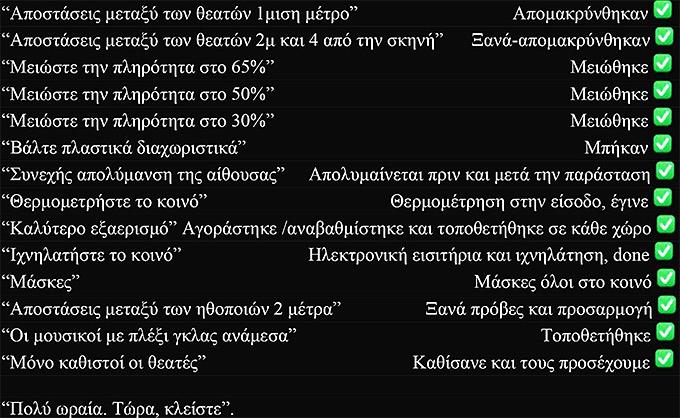 Όπως αναφέρει το ευφάνταστα ποστ που αναδημοσίευσε ο ηθοποιός Αργύρης Ξάφης πριν το οριστικό κλείσιμο ο αριθμός των επιτρεπόμενων θεατών μειωνόταν συνεχώς, ενώ οι απαραίτητες συνθήκες υγιεινής άλλαζαν διαρκώς.