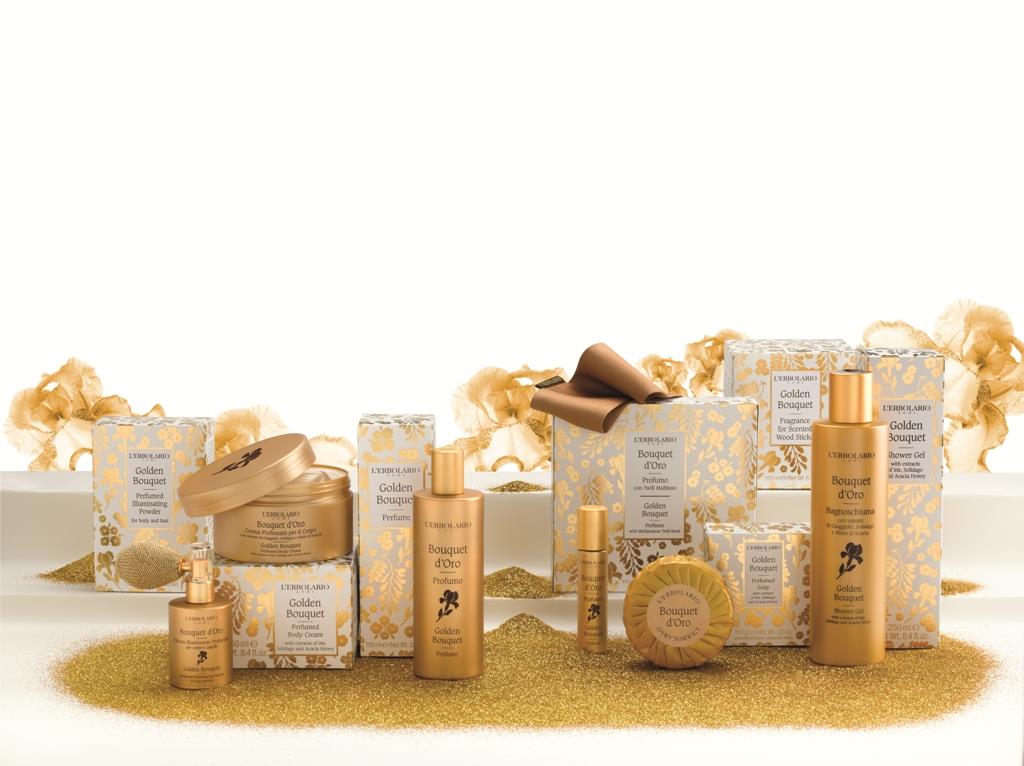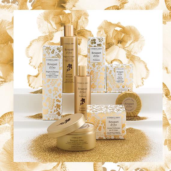Για τη σειρά Bouquet d’Oro η L’Erbolario αξιοποίησε με μοναδικό τρόπο τα πλούσια συστατικά της Kίτρινης Ίριδας, του Σολιδάγου και του Χαμομηλιού - λουλούδια με λαμπερό χρυσό χρώμα – συνδυασμένα αρμονικά με το «πολύτιμο» για το δέρμα χρυσό μέλι Acacia, σε μία σειρά που μας ταξιδεύει