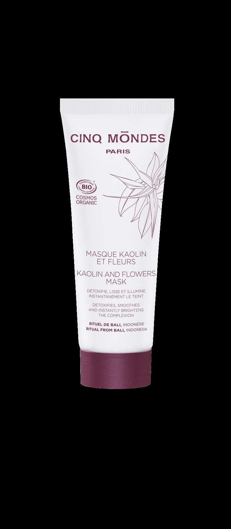 Μάσκα- κρέμα προσώπου αποτοξίνωσης, λείανσης και λάμψης, βιολογικό προϊόν με 99% φυσικά συστατικά και σφραγίδα cosmo-organic label. Ανήκει στο τελετουργικό του Μπαλί όπως όλα τα καθαριστικά προϊόντα της Cinq Mondes, Micellar Water, Cleansing Balm, Cleansing Mousse, Rain Tonic etc. Τα εξωτικά λουλούδια του Μπαλί (ιβίσκος, γαρδένια, λωτός, ylang-ylang, frangipani) περιέχουν απαλά οξέα που χαρίζουν λάμψη στο δέρμα.,Τα επιπλέον δραστικά συστατικά της μάσκας, είναι το εκχύλισμα λεμονιού που καθαρίζει εις βάθος και αποτοξινώνει, και ο κόκκινος άργιλος που μαζί με τη καολίνη απορροφούν τις ακαθαρσίες και ρυθμίζουν την λιπαρότητα του δέρματος.