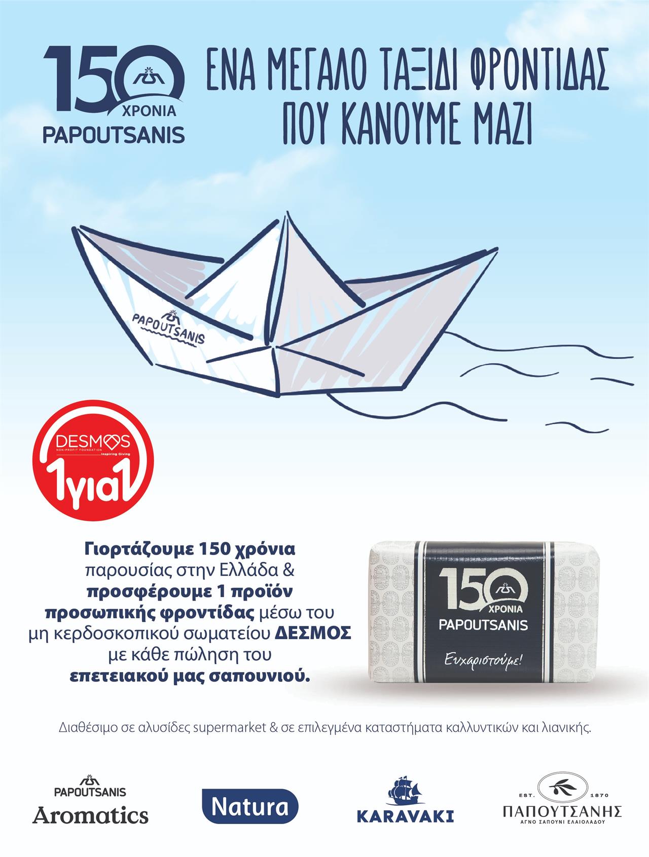Με κεντρικό μήνυμα: «150 Χρόνια Παπουτσάνης. Ένα μεγάλο ταξίδι φροντίδας που κάνουμε μαζί» η εταιρεία υπογράφει την ξεχωριστή της πορεία στο χρόνο, με μοναδικές προσφορές, διαγωνισμούς και πρωτοβουλίες για τους καταναλωτές, αλλά και δράσεις με ισχυρό κοινωνικό πρόσημο.