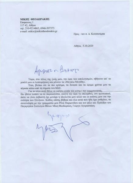 «Τώρα στο τέλος της ζωής μου, την ώρα των απολογισμών, σβήνουν απ’ το μυαλό μου οι λεπτομέρειες και μένουν τα “Μεγάλα Μεγέθη”. Έτσι βλέπω ότι τα πιο κρίσιμα, τα δυνατά και τα ώριμα χρόνια μου τα πέρασα κάτω από τη σημαία του ΚΚΕ. Για το λόγο αυτό θέλω να αφήσω αυτόν τον κόσμο σαν κομουνιστής. Θα ήθελα λοιπόν να σε παρακαλέσω εκείνη την ώρα να επιληφθείς εσύ προσωπικά ώστε να να γίνει σεβαστή όχι μονάχα η ιδεολογία μου αλλά και οι αγώνες μου για την ενότητα των Ελλήνων. Καθώς επίσης βέβαια και όλα αυτά που ήδη έχω ρυθμίσει, σε συνεννόηση με την γραμματέα μου Ρένα Παρμενίδου και τον φίλο και Πρόεδρο του Παγκρητίου Συλλόγου Φίλων Μίκη Θεοδωράκη, Γιώργο Αγοραστάκη» ».