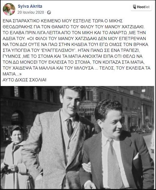 Το 2020 ο Μίκης Θεοδωράκης αποφάσισε να δημοσιεύσει τον τρόπο με τον οποίο αποχαιρέτησε τον Μάνο Χατζιδάκι, μέσω επιστολής στη φίλη του Σύλβα Ακρίτα. Το κείμενο έλεγε: ««ΟΙ ΦΙΛΟΙ ΤΟΥ ΜΑΝΟΥ ΧΑΤΖΙΔΑΚΙ ΔΕΝ ΜΟΥ ΕΠΕΤΡΕΨΑΝ ΝΑ ΤΟΝ ΔΩ! ΟΥΤΕ ΝΑ ΠΑΩ ΣΤΗΝ ΚΗΔΕΙΑ ΤΟΥ! ΕΓΩ ΟΜΩΣ ΤΟΝ ΒΡΗΚΑ ΣΤΑ ΥΠΟΓΕΙΑ ΤΟΥ 'ΕΥΑΓΓΕΛΙΣΜΟΥ’. ΗΤΑΝ ΠΑΝΩ ΣΕ ΕΝΑ ΤΡΑΠΕΖΙ, ΓΥΜΝΟΣ ,ΜΕ ΤΟ ΣΤΟΜΑ ΚΑΙ ΤΑ ΜΑΤΙΑ ΑΝΟΙΧΤΑ! ΕΙΠΑ ΟΤΙ ΘΕΛΩ ΝΑ ΤΟΝ ΔΩ ΜΟΝΟΣ! ΤΟΥ ΕΚΛΕΙΣΑ ΤΟ ΣΤΟΜΑ, ΤΟΝ ΚΟΙΤΑΖΑ ΣΤΑ ΜΑΤΙΑ, ΤΟΥ ΧΑΙΔΕΨΑ ΤΑ ΜΑΛΛΙΑ ΚΑΙ ΤΟΥ ΜΙΛΟΥΣΑ … ΤΕΛΟΣ, ΤΟΥ ΕΚΛΕΙΣΑ ΤΑ ΜΑΤΙΑ…»