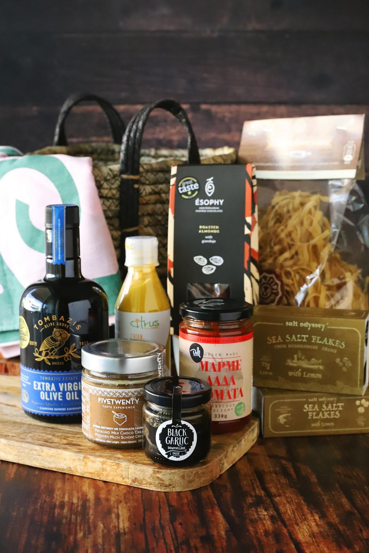 Χυλοπίτες Ολικής Αλέσεως Μαγγίρι, Μαρμελάδα Ντομάτα DeliRoom, Νιφάδες Θαλασσινού Αλατιού με Λεμόνι Salt Odyssey, Πάστα Μαύρου Σκόρδου Black Garlic DownVillage, Κρέμα Πραλίνα με Φιστίκι Αιγίνης FiveTwenty, Εξαιρετικά Παρθένο Ελαιόλαδο Tombazis, Μουστάρδα Χιώτικου Μανταρινιού με Έλαιο Τρούφας Citrus Άρωμα Μνήμης & Καραμελωμένα Αμύγδαλα σε Gianduja Esophy.