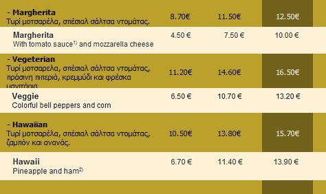 Η φωτόγραφία που ακολουθεί εικονίζει τις τιμές της Pizza Hut για τα προϊόντα της φίρμας στην Ελλάδα και τη Γερμανία- την οικονομική «ατμομηχανή» της Ε.Ε.
