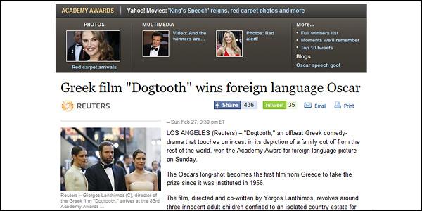 Σκηνικό ψευδούς ειδησεογραφίας έφτιαξε το πρακτορείο Reuters όσον αφορά το νικητή του Όσκαρ ξενόγλωσσης ταινίας "απονέμοντας" εκ παραδρομής τη διάκριση στον ελληνικό Κυνόδοντα. Το ρεπορτάζ ήταν σχεδόν πλήρες αναφέροντας ότι ήταν η πρώτη ελληνική ταινία που παίρνει Όσκαρ μετά το 1956!