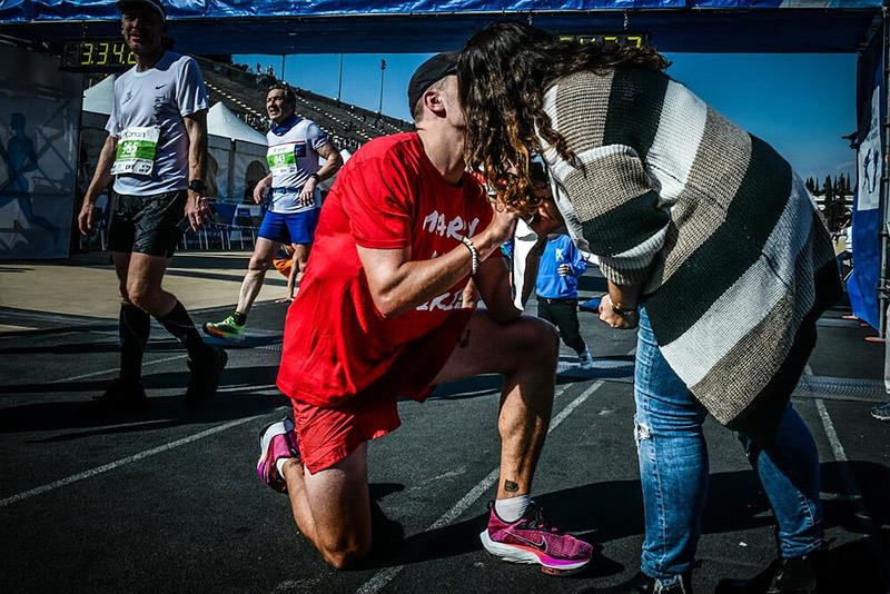 Οι φωτογραφίες από το πρακτορείο Eurokinissi που τράβηξε η Τατιάνα Μπόλαρη δείχνουν τη στιγμή κατά την οποία ένας δρομέας, αγνώστων στοιχείων, έχοντας μόλις τερματίσει την διαδρομή, κάνει πρόταση γάμου στην σύντροφό του.