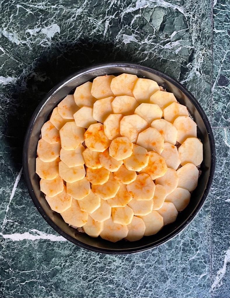 Απλώνουμε τον κιμά σε ένα ταψί σε πάχος περίπου 4 εκ. και με τα δάχτυλά μας τον πιέζουμε σε όλη την επιφάνεια για να δημιουργηθούν κοιλότητες, σαν κρατήρες, οι οποίες θα απορροφήσουν την σάλτσα κι έτσι το φαγητό θα μείνει ζουμερό. Καλύπτουμε την επιφάνεια με πατάτες κομμένες σε λεπτές ροδέλες, τις οποίες έχουμε αλατοπιπερώσει και πασπαλίσει προαιρετικά με γλυκιά πάπρικα. Περιχύνουμε το φαγητό με τη σάλτσα και κουνάμε το ταψί κυκλικά για να πάει παντού. Σκεπάζουμε με αλουμινόχαρτο, κάνουμε λίγες τρύπες με τη μύτη ενός μαχαιριού για να φεύγει ο ατμός και ψήνουμε σε προθερμασμένο φούρνο στους 180ο C για περίπου 30’. Αφαιρούμε το αλουμινόχαρτο και ψήνουμε για λίγο ακόμη μέχρι να ροδίσουν και να ξεροψηθούν οι πατάτες. Σερβίρουμε στα πιάτα σε μερίδες και πασπαλίζουμε με έξτρα καβουρδισμένους κουκουναρόσπορους και μαϊντανό. Αν το φαγητό μετά το ψήσιμο έχει πολύ ζουμί (αυτό εξαρτάται και από το είδος του κιμά), το αφαιρούμε γέρνοντας το ταψί στον νεροχύτη με προσοχή. Αυτό που επίσης θα παρατηρήσετε είναι ότι η μάζα του κεφτέ θα έχει λίγο συρρικνωθεί: αυτό είναι λογικό λόγω του ψησίματος,