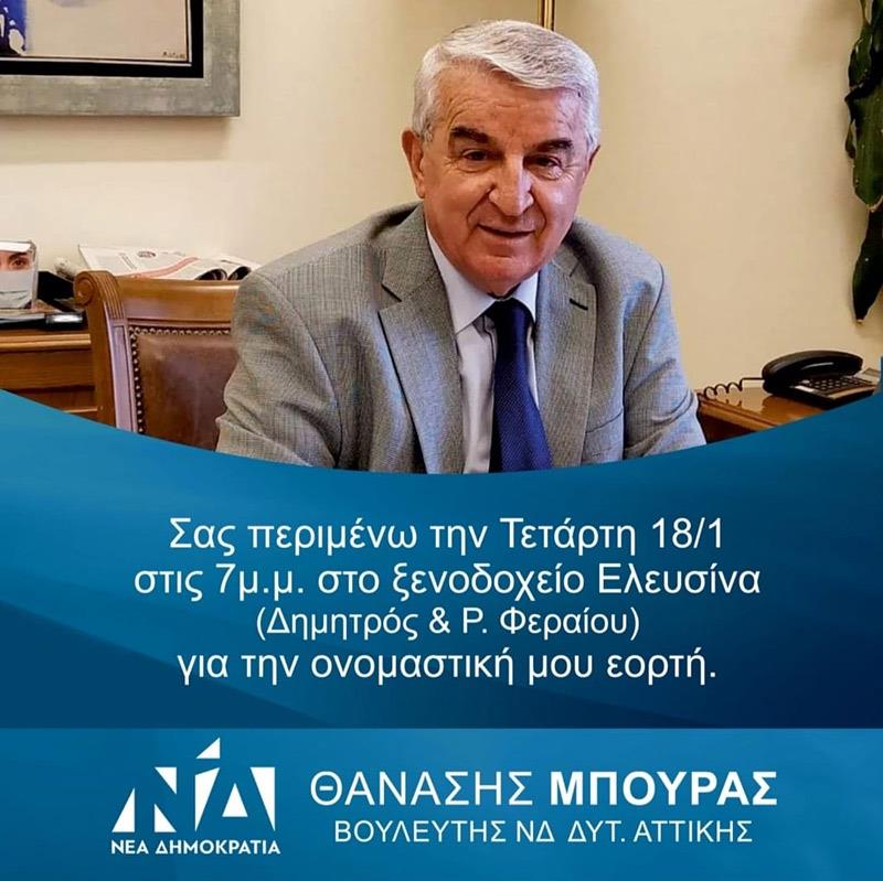 Ο βουλευτής της ΝΔ Θανάσης Μπούρας είχε χθες την ονομαστική του εορτή και αποφάσισε να δημοσιεύσει μια αφίσα – κάλεσμα προς τους ψηφοφόρους του για να γιορτάσουν μαζί.