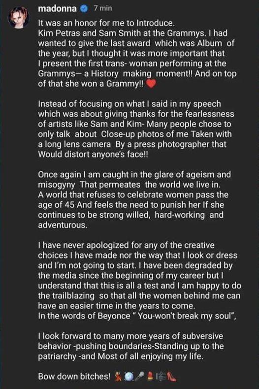 Με μια ανάρτησή της στο Instagram, η Madonna, όπως πάντα θεά, βουλώνει στόματα και πετσοκόβει κόσμο, λέγοντας συγκεκριμένα τα εξής: