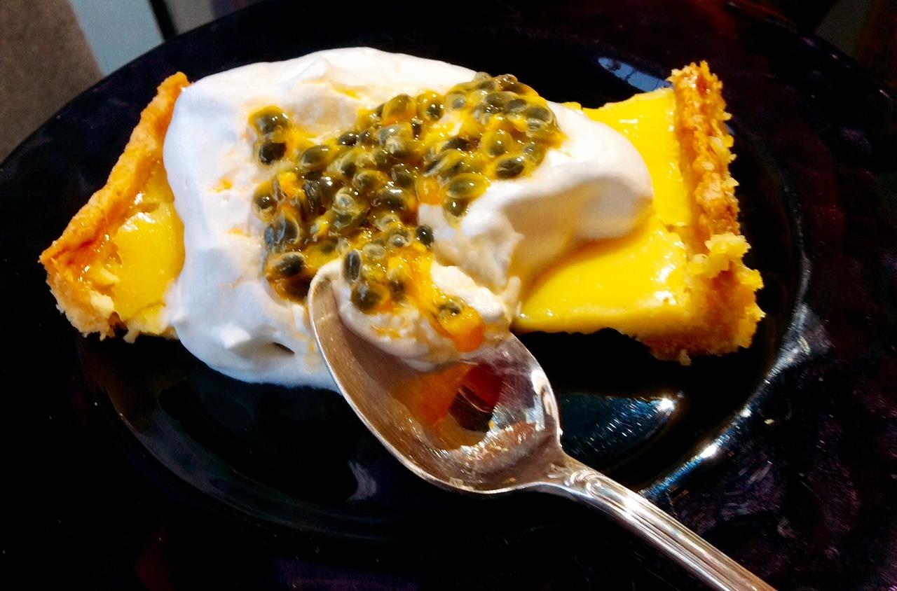 Όσο ψήνεται η ζύμη ετοιμάζουμε τη γέμιση. Τοποθετούμε πάνω από ένα βαθύ μπολ μια λεπτή σήτα. Με ένα κουτάλι αφαιρούμε τη σάρκα από 5-7 μεγαλούτσικα φρούτα του πάθους και τα βάζουμε μέσα στη σήτα για να πάρουμε τη μεγαλύτερη ποσότητα του χυμού τους. Δεν πετάμε τα σπόρια, τα κρατάμε για το σερβίρισμα. Θα χρειαστούμε 5 γεμάτες κ.σ. χυμό. Επειδή όμως δεν είναι όλα τα φρούτα του πάθους το ίδιο ζουμερά, ενδέχεται να μην συγκεντρώσουμε την απαιτούμενη ποσότητα, οπότε συμπληρώνουμε με χυμό λεμονιού. Σε μία μικρή κατσαρόλα ανακατεύουμε με το σύρμα 5 αυγά με 1/3 φλ. τσ. ζάχαρη και μόλις λιώσει η ζάχαρη προσθέτουμε τον χυμό, λεπτό ξύσμα από 1 λεμόνι και 2/3 φλ. τσ. κρέμα γάλακτος. Ζεσταίνουμε ελαφρώς το μίγμα σε μέτρια προς χαμηλή φωτιά ανακατεύοντας συνεχώς με το σύρμα : δεν θέλουμε να ψηθεί η κρέμα, απλώς να χλιάνει. Την σουρώνουμε για κάθε ενδεχόμενο και γεμίζουμε την τάρτα : επειδή η κρέμα είναι υδαρής, καλό είναι να τοποθετήσουμε πρώτα την φόρμα με την ψημένη ζύμη στη σχάρα του φούρνου και να ρίξουμε με προσοχή την κρέμα. Ψήνουμε για περίπου 25΄, μέχρι να ψηθεί η κρέμα, χωρίς όμως να παραψηθεί, γιατί κρυώνοντας θα πήξει κι άλλο : γι’ αυτό, όταν την βγάλουμε από τον φούρνο πρέπει να είναι ελαφρώς τρεμουλιαστή στο μέσον. Αφήνουμε την τάρτα να κρυώσει εντελώς. Σερβίρουμε γαρνίροντας με ελαφριά chantilly και τα σπόρια των φρούτων που κρατήσαμε.