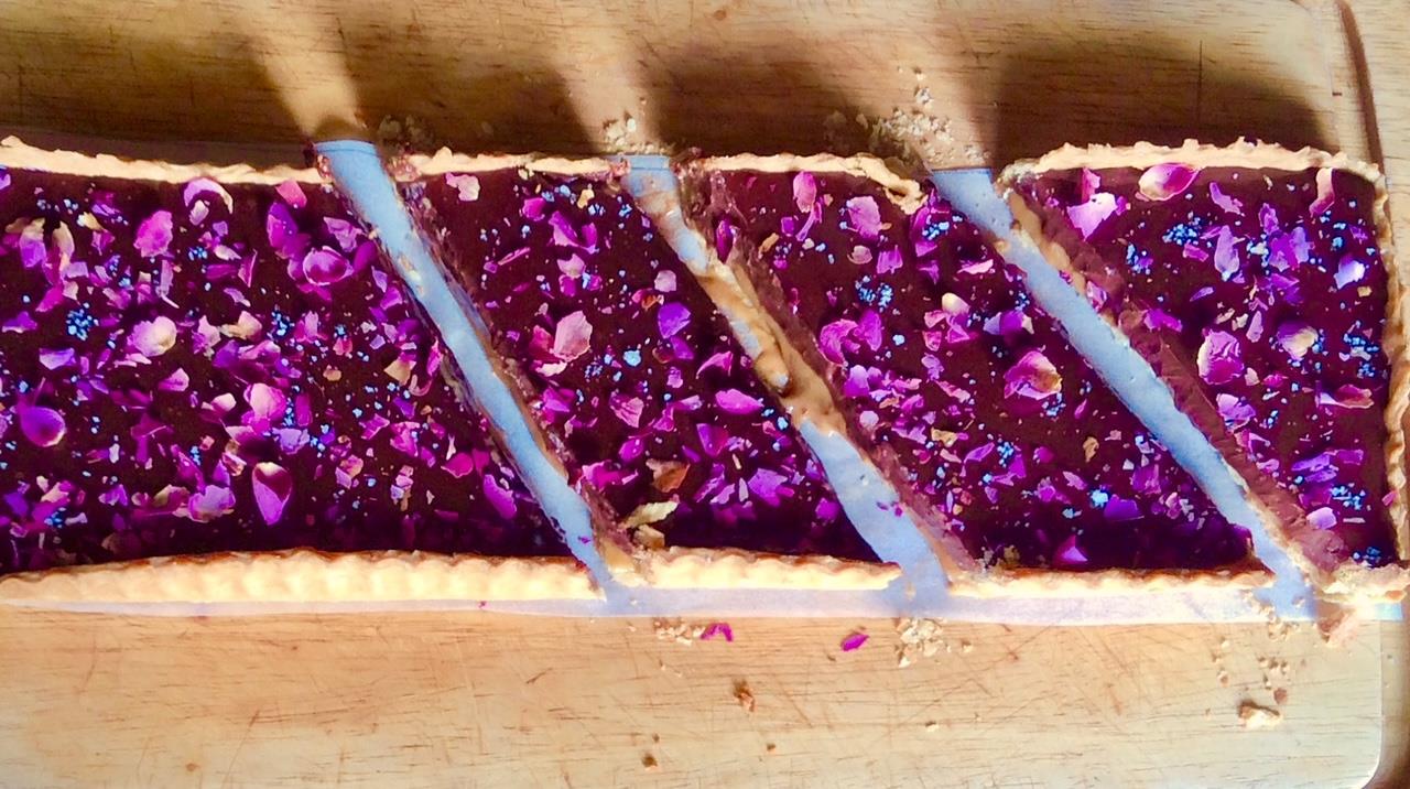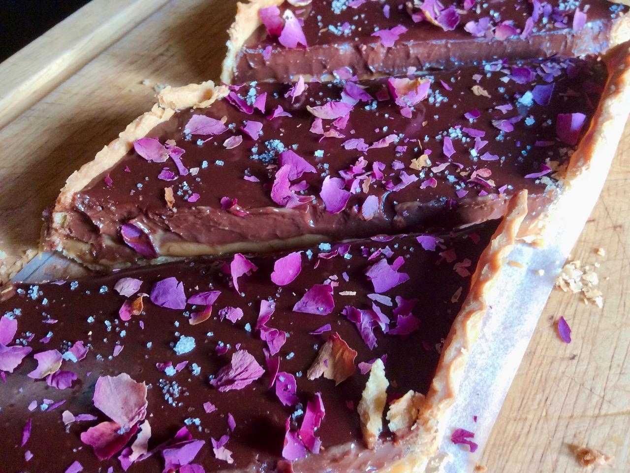 Συναρμολογούμε την τάρτα. Απλώνουμε στον πάτο της ζύμης λίγη από την καραμέλα (συνιστώ μικρή ποσότητα, σαν να αλείφαμε ψωμί με βούτυρο). Από πάνω στρώνουμε τη ganache και βάζουμε την τάρτα στο ψυγείο. Πριν σερβίρουμε την βγάζουμε για 30΄ από το ψυγείο και την πασπαλίζουμε με λίγο άνθος αλατιού και βρώσιμα ροδοπέταλα, φρέσκα ή αποξηραμένα.