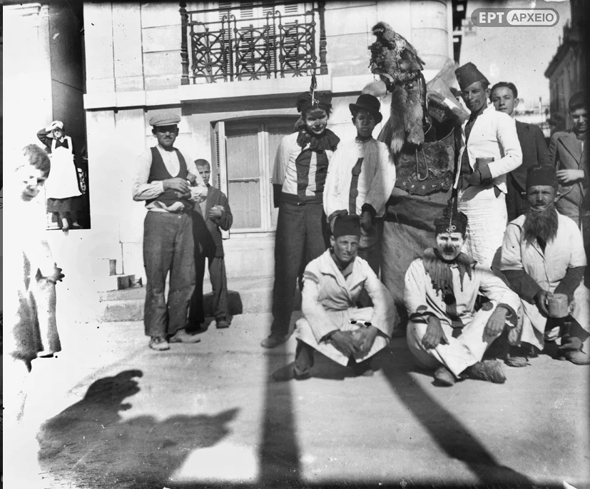 Μασκαράδες ποζάρουν δίπλα σε μια καμήλα. Αθήνα, 1915 – 1930. Φωτογραφικό αρχείο του Πέτρου Πουλίδη (ΕΡΤ)