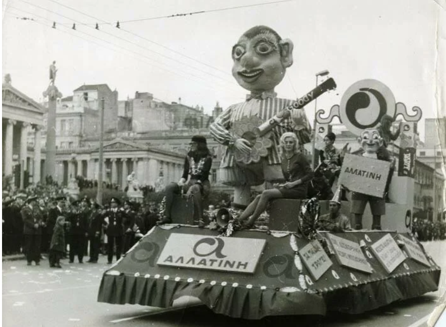 Άρμα των μπισκότων Παπαδοπούλου στην Πανεπιστημίου σε κάποιο παλιότερο αθηναϊκό καρναβάλι, ημερομηνία άγνωστη.
