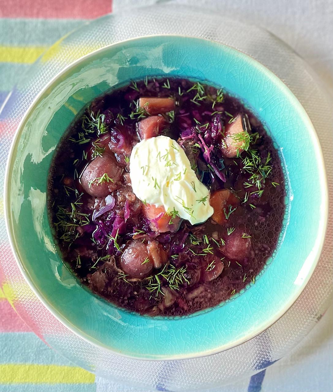 Η σούπα: Χρειαζόμαστε ένα κομμάτι βοδινού ή μοσχαριού με κόκαλο, συνολικού βάρους περίπου 1,5 κιλού. Εγώ βρήκα ένα ξεγυρισμένο βοδινό οσομπούκο που αποδείχτηκε τέλειο γιατί, ενώ δεν είναι άπαχο, δεν είναι τόσο λιπαρό σαν την στηθοπλευρά, έχει και μπόλικο κρέας που συμπλήρωσε το ψαχνό που φύλαξα από τη στηθοπλευρά του ζωμού. Από λαχανικά χρειαζόμαστε 2 καρότα κομμένα σε σχετικά λεπτές ροδέλες, 2 κλαριά σέλερι κομμένα σε σχετικά λεπτές ροδέλες, 1 κρεμμύδι ψιλοκομμένο, 1 μεγάλη πατάτα κομμένη σε κύβους περίπου 2 x 2 εκ., 4 παντζάρια κομμένα στα 2 ή στα 4 αναλόγως του μεγέθους τους, 2 μέτριες ρέβες κομμένες σε κύβους περίπου 2 x 2 εκ. και κάποια άλλη χειμωνιάτικη ρίζα, όπως η παστινάκη (parsnip) ή σελινόριζα (2 παστινάκες ή μισή μικρή σελινόριζα), κομμένη κι αυτή σε ισομεγέθεις κύβους. Θα χρειαστούμε επίσης και ¼ κόκκινο λάχανο (προτίμησα το κόκκινο για το χρώμα του, αλλά μπορείτε να το αντικαταστήσετε με λευκό). Σε ένα βαθύ τηγάνι λιώνουμε λίγο αγελαδινό βούτυρο και σοτάρουμε τα λαχανικά σε μέτρια φωτιά, πλην του λάχανου, γιατί αυτό θα το βάλουμε στη σούπα τελευταίο γιατί μαγειρεύεται πολύ πιο γρήγορα. Αλατοπιπερώνουμε τα λαχανικά και τα αφήνουμε προς το παρόν στην άκρη. Ζεσταίνουμε μια κατσαρόλα με χοντρό πάτο, προσθέτουμε λίγο ελαιόλαδο και σοτάρουμε σε δυνατή φωτιά το κρέας να ροδίσει από όλες τις πλευρές. Προσθέτουμε 1 ποτήρι του νερού κόκκινο κρασί και μόλις εξατμισθεί το αλκοόλ σκεπάζουμε με ζωμό. Ξαφρίζουμε επιμελώς και μόλις σταματήσει το άφρισμα προσθέτουμε τα μπαχαρικά που έχουμε δέσει σε γάζα: 2 κόκκους μπαχάρι, 2 κεδροκούκουτσα, 2 φύλλα δάφνης, λίγους κόκκους πιπεριού και λίγους σπόρους κόλιανδρου. Χαμηλώνουμε την φωτιά και σιγοβράζουμε για περίπου ένα δίωρο ή και περισσότερο, μέχρι το κρέας να ξεκολλάει εντελώς από το κόκαλο. Όταν τα υγρά λιγοστεύουν, συμπληρώνουμε με ζωμό. Περίπου στη μέση του μαγειρέματος αρχίζουμε να αλατίζουμε σταδιακά. Αφαιρούμε το κρέας, το ξεψαχνίζουμε, το κόβουμε σε κομμάτια μεγέθους μπουκιάς και το ξαναβάζουμε στην κατσαρόλα μαζί με τα κομμάτια του κρέατος που φυλάξαμε από τον ζωμό και το μεδούλι που βγάζουμε από το κόκαλο. Προσθέτουμε και τα σοταρισμένα λαχανικά, 1 ποτήρι του νερού ζουμί από παντζάρι τουρσί (βλ. tips) και σιγοβράζουμε μέχρι να μαλακώσουν τα λαχανικά και να μειωθεί ο όγκος του υγρού. Προς το τέλος προσθέτουμε και το λάχανο. Αφαιρούμε τη γάζα με τα μπαχαρικά. Δοκιμάζουμε τη γεύση και τη διορθώνουμε αν χρειαστεί.