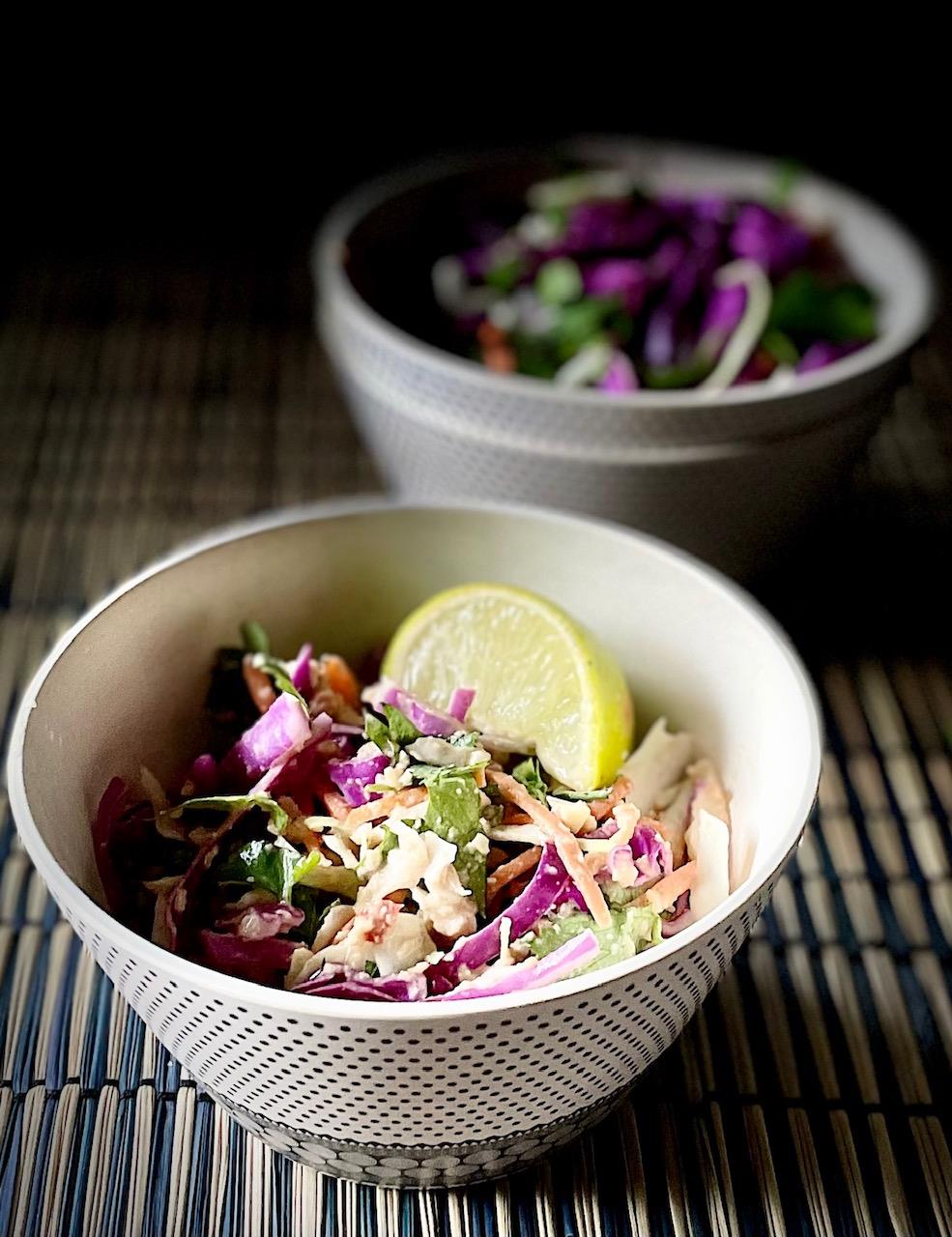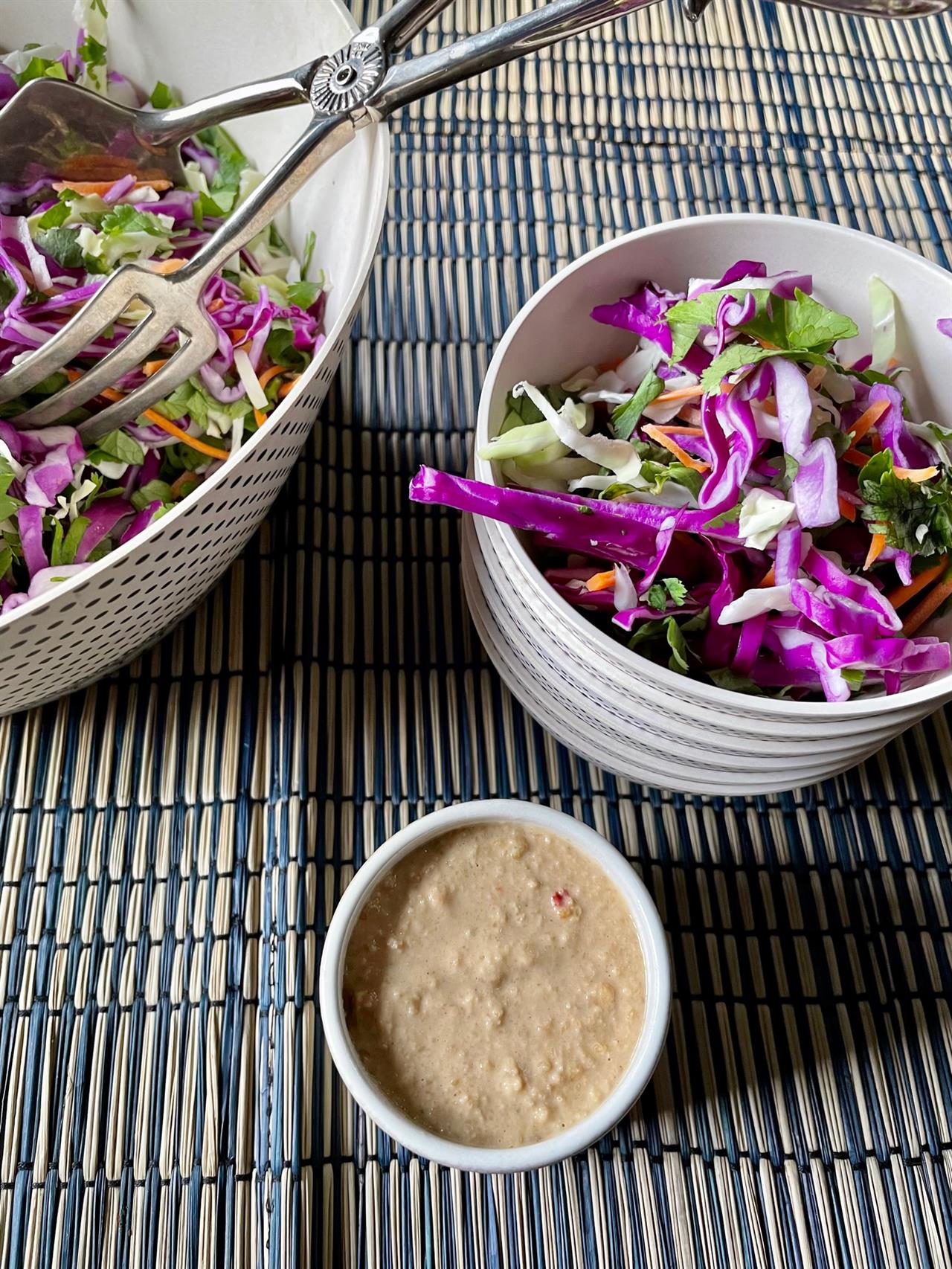 Για 6 άτομα. Τρίβουμε 2 καρότα στον χοντρό τρίφτη και ψιλοκόβουμε ½ μικρό λευκό λάχανο και ½ μικρό κόκκινο λάχανο. Ψιλοκόβουμε επίσης και 1 μάτσο φρέσκο κόλιανδρο. Τα βάζουμε σε βαθύ μπολ, τα αλατίζουμε ελαφρά, προσθέτουμε λίγο εξαιρετικό παρθένο ελαιόλαδο και τον χυμό από 2 μοσχολέμονα (limes). Τα αφήνουμε λίγη ώρα για να μαραθούν ελαφρώς. Ετοιμάζουμε το dressing:
