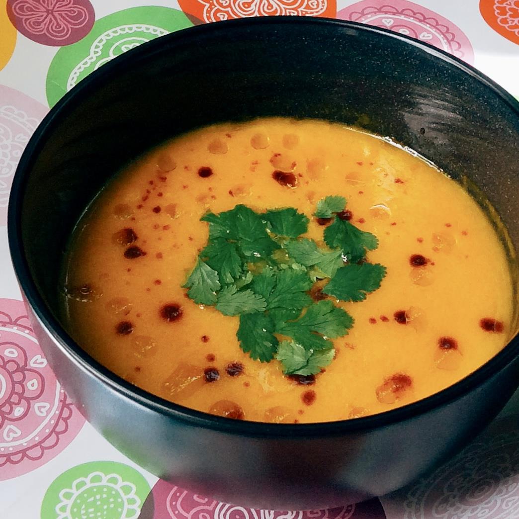 Σε μία κατσαρόλα σοτάρουμε ελαφρά σε λίγο ελαιόλαδο 1 μεγάλο κρεμμύδι ψιλοκομμένο και μόλις μαλακώσει αλλά χωρίς να πάρει χρώμα, προσθέτουμε 1 κιλό καρότα κομμένα σε ροδέλες, 1 μεγαλούτσικο κομμάτι ginger ψιλοκομμένο και 1 κλωνάρι lemongrass κομμένο σε φέτες (βλ. tips). Γυρίζουμε λίγο τα λαχανικά στην κατσαρόλα, αλατοπιπερώνουμε και προσθέτουμε προαιρετικά κάποιο καυτερό υλικό : ψιλοκομμένο φρέσκο chili ή μπούκοβο. Σκεπάζουμε τα λαχανικά με 2 lt ζωμό λαχανικών. Σιγοβράζουμε με σκεπασμένο το σκεύος για περίπου 30΄, μέχρι να μαλακώσουν τα καρότα. Αφαιρούμε το lemongrass και πολτοποιούμε τη σούπα. Προσθέτουμε χυμό από μοσχολέμονο (lime), διορθώνουμε τη γεύση και σερβίρουμε γαρνίροντας με φρέσκο κόλιανδρο και προαιρετικά σταγόνες από κάποια καυτερή σάλτσα (π.χ. Tabasco ή sriracha).