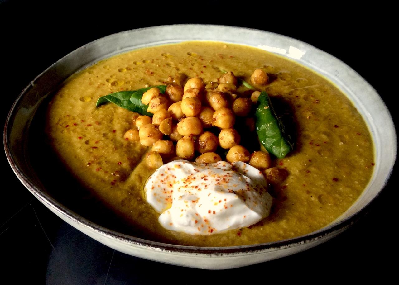 Ζεσταίνουμε καλά μια κατσαρόλα με βαρύ πάτο, προσθέτουμε λίγο ελαιόλαδο ή λάδι καρύδας ή λάδι από σιναπόσπορο (βλ. tips) και σοτάρουμε 1 ξερό κρεμμύδι ψιλοκομμένο, 1 κομμάτι ginger ψιλοκομμένο ή τριμμένο, 1 κ.γλ. κουρκουμά, 1 κ.σ. κάρυ και μια πρέζα μπούκοβο ή chili ή πιπέρι cayenne. Μόλις μυρίσουν τα μπαχαρικά προσθέτουμε 1 σκ. σκόρδου ψιλοκομμένη και σοτάρουμε για λίγο ακόμη. Τα αφαιρούμε με τρυπητή κουτάλα από το σκεύος και τα αφήνουμε προς το παρόν στην άκρη. Στη θέση τους βάζουμε 500 γρ. ρεβίθια που τα έχουμε προβράσει (βλ. tips) και τα σοτάρουμε μέχρι να πάρουν ωραίο χρώμα. Βγάζουμε 2 χούφτες ρεβίθια και τα αφήνουμε στην άκρη για το γαρνίρισμα του φαγητού. Επιστρέφουμε στην κατσαρόλα τα σοταρισμένα λαχανικά και σκεπάζουμε τα υλικά με βραστό νερό. Χαμηλώνουμε την ένταση της εστίας και σιγοβράζουμε τα ρεβίθια μέχρι να χυλώσουν τέλεια. Αν χρειαστεί, προσθέτουμε σταδιακά λίγο νερό. Περνάμε τα υλικά της σούπας στον μύλο των λαχανικών για να απομακρύνουμε τις φλούδες των ρεβιθιών (βλ. tips). Δοκιμάζουμε για να διορθώσουμε, αν χρειαστεί, το αλατοπίπερο και μοιράζουμε τη σούπα στα μπολ. Γαρνίρουμε με λίγα φύλλα νεαρού σπανακιού, τα ρεβίθια που κρατήσαμε στην άκρη και 1 κουταλιά γιαούρτι. Μπορούμε επίσης να στάξουμε και λίγες σταγόνες λεμονιού. Τέλος, ραντίζουμε με σταγόνες ελαιολάδου και προαιρετικά, πασπαλίζουμε με λίγο έξτρα καυτερό πιπέρι (το ίδιο που χρησιμοποιήσαμε στην αρχή).