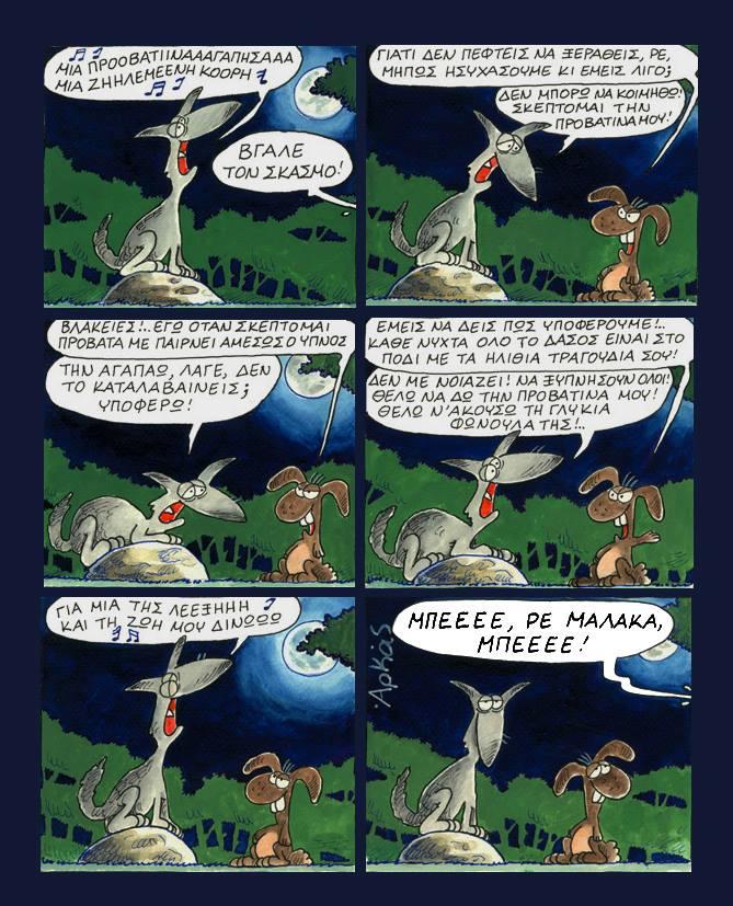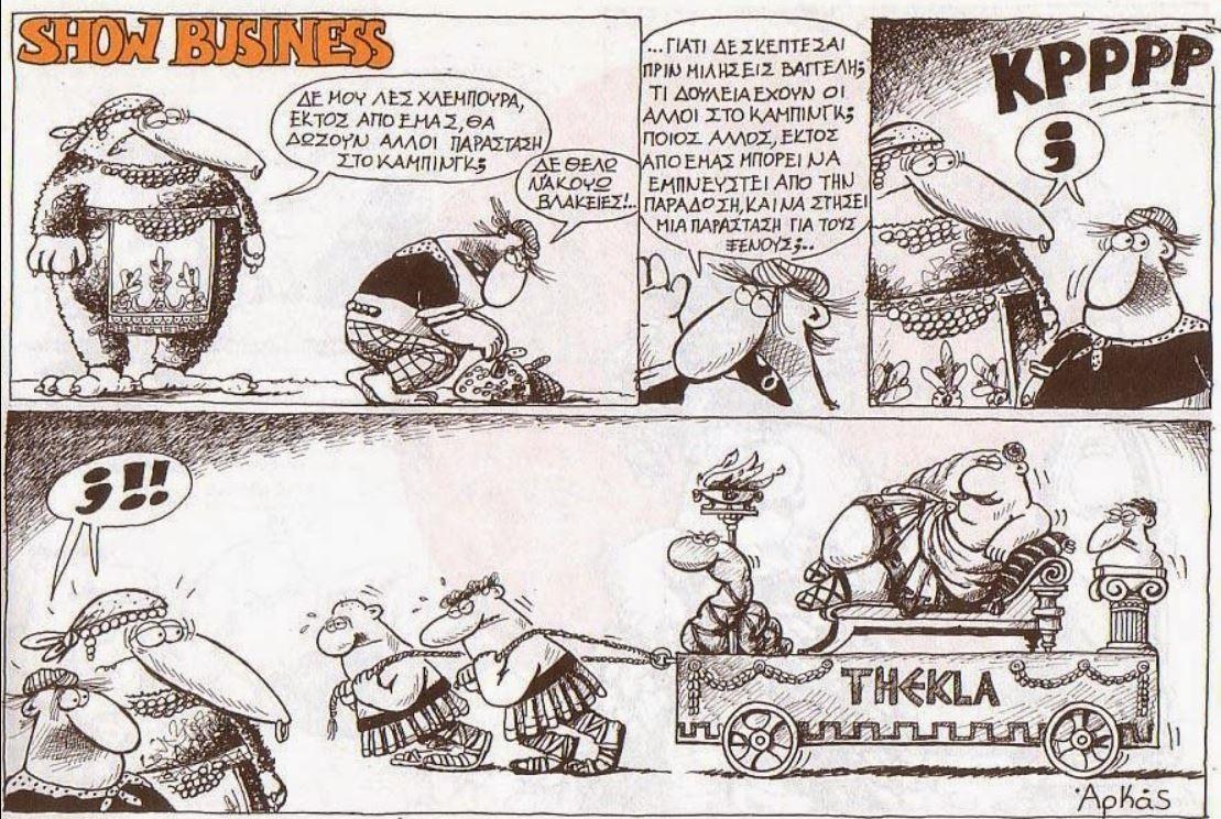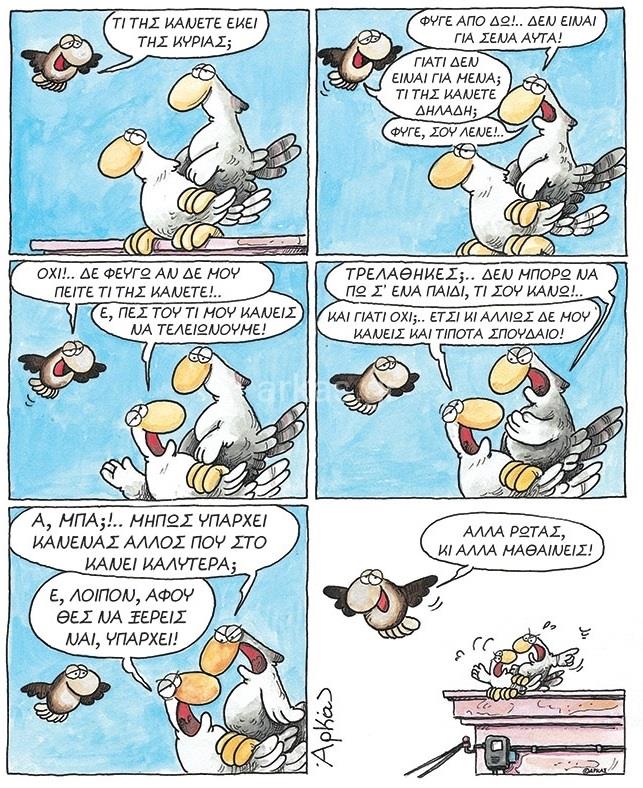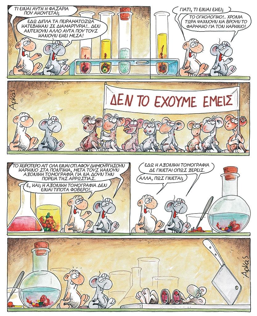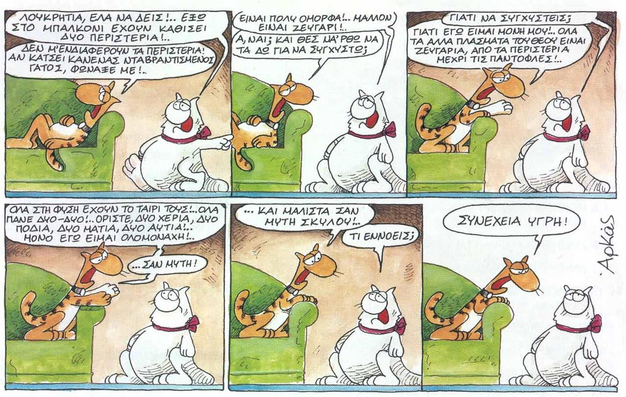 Η Λουκρητία, ο Μοντεχρήστος, τα σπουργίτια, ο Κόκορας, τα Πειραματόζωα και όλα εκείνα τα σκίτσα του Αρκά που καμία σχέση δεν είχαν με τηγανιτές πατάτες.