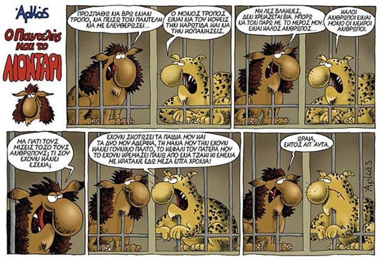 Το λιοντάρι στο ζωολογικό κήπο που δουλεύει ο Παντελής δεν είναι ένα οποιοδήποτε λιοντάρι. Είναι ένα ευφυές, πολιτικοποιημένο και ειρηνιστικό λιοντάρι. Που θέλει την ελευθερία του. Το πρόβλημα είναι ότι ο Παντελής είναι ένας απλός, μισθοσυντήρητος και ευθυνόφοβος υπάλληλος που δε λέει να το ελευθερώσει. Και ο πάνθηρας επιμένει πως πρέπει να τον βγάλουν απ’ τη μέση. Ίσως η πιο υποτιμημένη σειρά του Αρκά, δημοσιεύτηκε για πρώτη φορά το 1987 στο περιοδικό Σχολιαστής.
