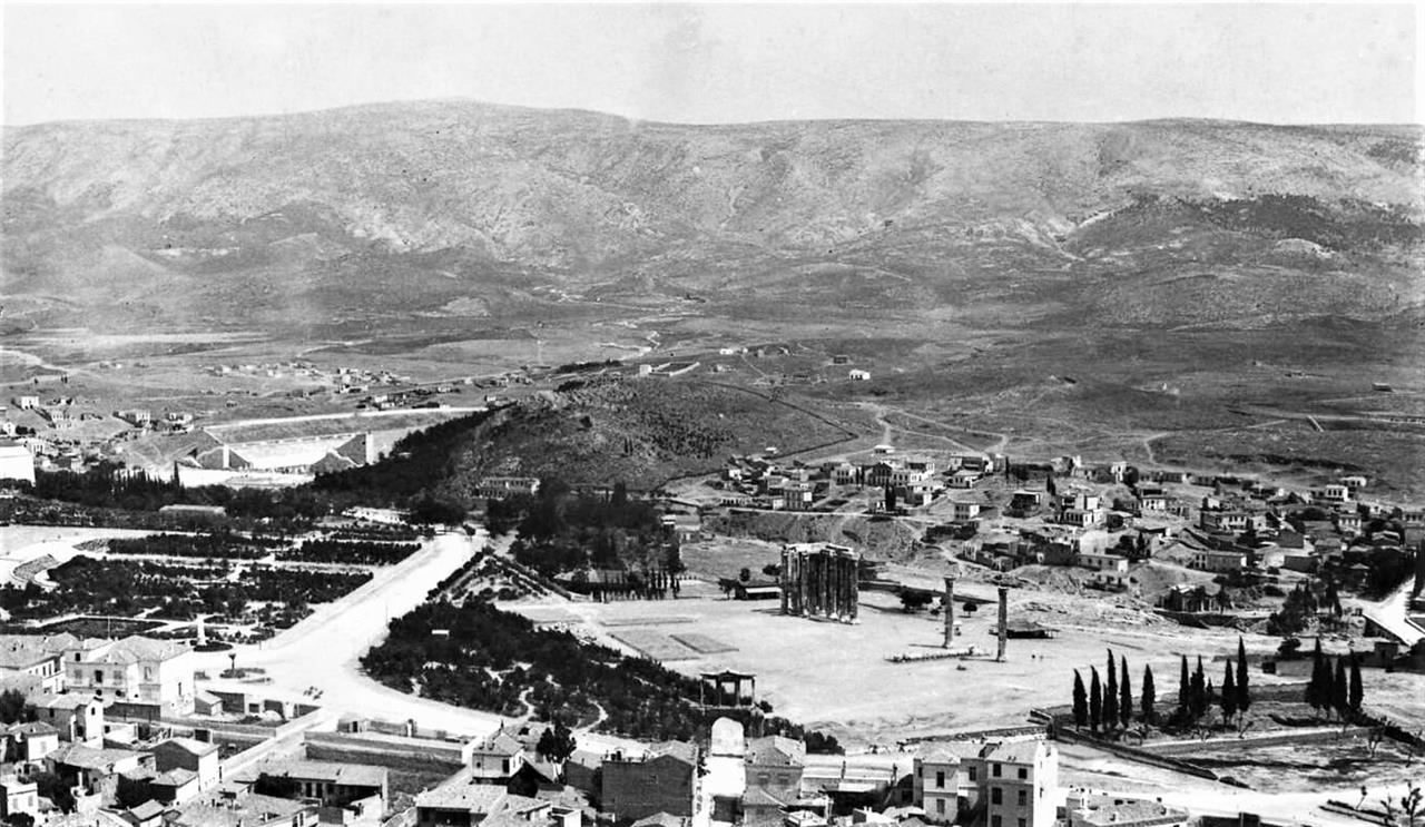 Η Αθήνα από ψηλά, με τον ναό Ολυμπίου Διός, και στο βάθος αριστερά το Παναθηναϊκό Στάδιο, πιθανότατα το 1897. Φωτογράφος Mr Walter Leaf.