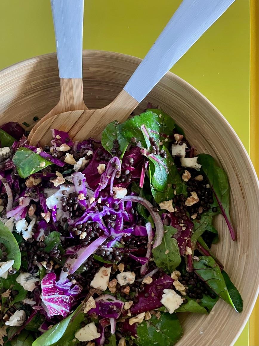 Σε ένα μικρό τηγάνι καβουρδίζουμε ελαφρά 1 μεγάλη χούφτα καρύδια και μόλις κρυώσουν τα χοντροκόβουμε με κοφτερό μαχαίρι. Παράλληλα, βράζουμε 100 γρ. μαύρες φακές σε άφθονο αλατισμένο νερό και τις στραγγίζουμε. Κόβουμε 1 μέτριο ξερό κρεμμύδι στη μέση και κατόπιν σε πολύ λεπτές φέτες. Κόβουμε ¼ κόκκινο λάχανο σε πολύ λεπτές φέτες και με τα δάχτυλά μας χοντροκόβουμε ½ radicchio. Ψιλοκόβουμε λίγα φύλλα εστραγκόν και ½ ματσάκι μαϊντανό. Βάζουμε όλα τα υλικά σε ένα μπολ, προσθέτουμε 2 μεγάλες χούφτες τρυφερά φύλλα παντζαριού, μία μικρή χούφτα μαύρες σταφίδες και λίγους κύβους ώριμης gorgonzola. Ετοιμάζουμε το dressing με λίγη μουστάρδα, ξύδι από κόκκινο ή λευκό κρασί, αλατοπίπερο και εξαιρετικό παρθένο ελαιόλαδο, το προσθέτουμε στο μπολ με τα υλικά και ανακατεύουμε καλά. Μοιράζουμε τη σαλάτα σε δύο πιάτα και την απολαμβάνουμε.