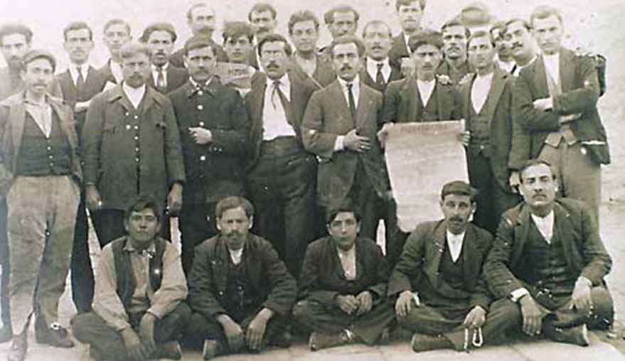 Ο Σταύρος Καλλέργης και μερικοί ακόμη σοσιαλιστές φωτογραφίζονται, συμμετέχοντας συμβολικά στην επέτειο της διαμαρτυρίας των εργατών στο Σικάγο.
