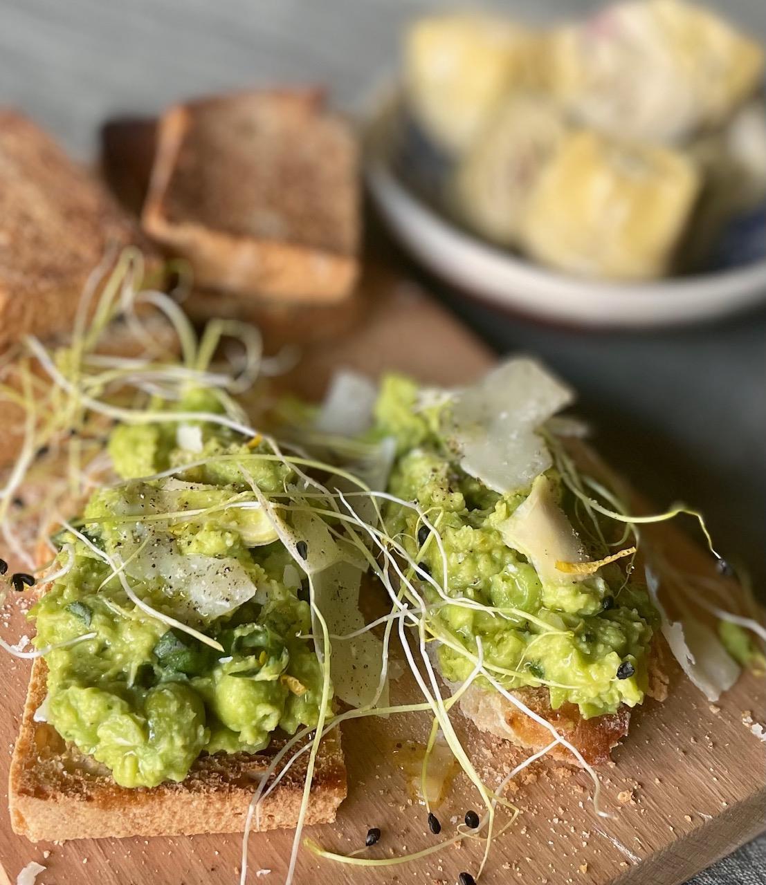 Καθαρίζουμε 500 γρ. φρέσκο αρακά, οπό τον οποίο θα πάρουμε περί τα 250 γρ. καθαρό βάρος. Σε μία κατσαρόλα φέρνουμε σε βρασμό άφθονο νερό, το αλατίζουμε, χαμηλώνουμε την φωτιά σε μέτρια και βράζουμε τον αρακά για περίπου 10’ μέχρι να μαλακώσει. Τον βαπτίζουμε αμέσως σε παγωμένο νερό για να κρατήσει το χρώμα του και κατόπιν τον στραγγίζουμε. Παίρνουμε το ξύσμα από 1 λεμόνι και το κρατάμε στην άκρη. Κρατάμε στην άκρη, επίσης, περίπου το 1/4 της ποσότητας του αρακά και πολτοποιούμε τον υπόλοιπο στο multi με τον χυμό από το ½ λεμόνι, 1 μικρή σκ. σκόρδου, εξαιρετικό παρθένο ελαιόλαδο, φρέσκο βασιλικό και αλατοπίπερο. Λειτουργούμε το μηχάνημα με συνεχόμενες διακεκομμένες κινήσεις για να φέρουμε την υφή στο επιθυμητό για εμάς στάδιο (βλ. tips).
