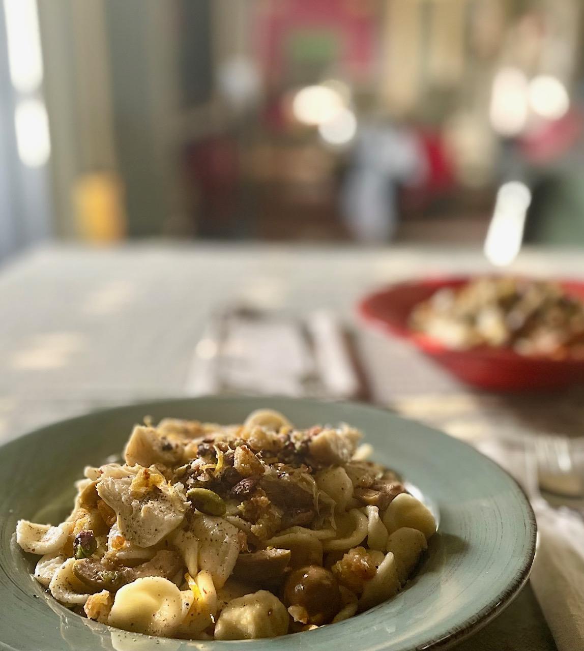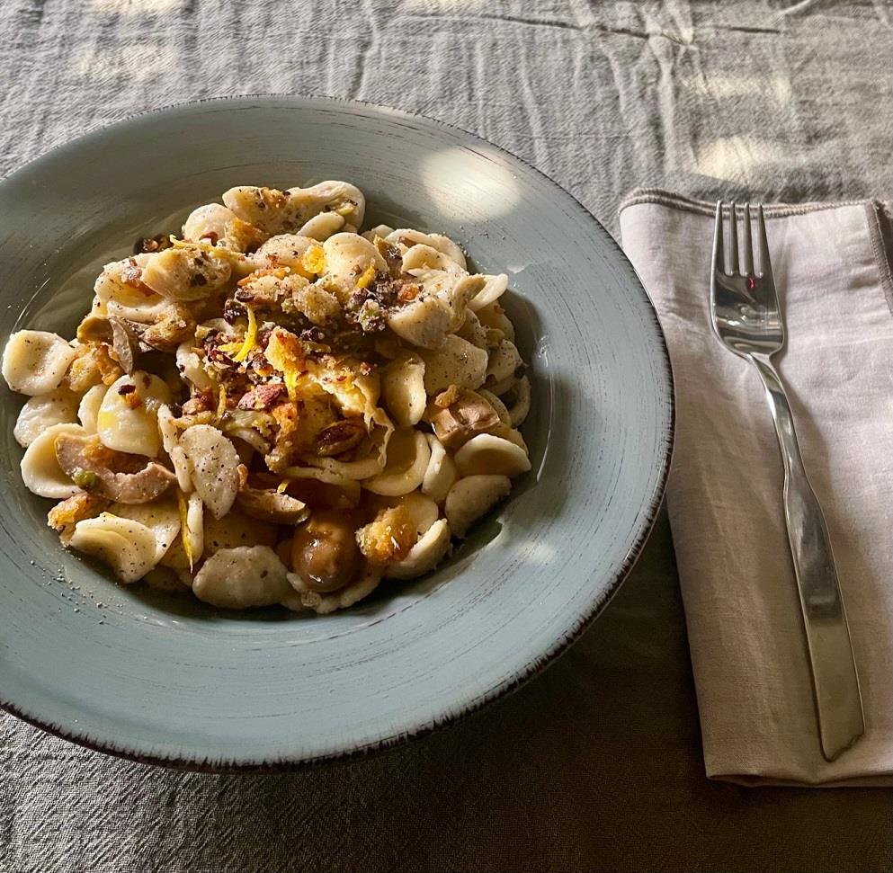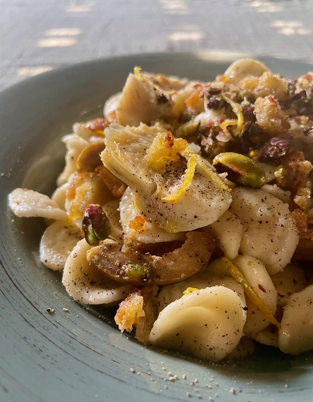 Βράζουμε 500 γρ. κοντά ζυμαρικά σε άφθονο αλατισμένο νερό και τα στραγγίζουμε. Όση ώρα βράζουν τα ζυμαρικά καβουρδίζουμε σε ένα τηγάνι και σε μέτρια φωτιά 100 γρ. άψητα και ανάλατα φιστίκια Αιγίνης. Μόλις χλιάνουν τα κόβουμε σε ακανόνιστα κομμάτια με το μαχαίρι του σεφ: άλλα μικρότερα κι άλλα μεγαλύτερα και κάποια τα αφήνουμε ολόκληρα. Ψήνουμε στην τοστιέρα 4 λεπτές φέτες μπαγιάτικου ψωμιού και μόλις κρυώσουν τις κάνουμε χοντρά ψίχουλα με τα δάχτυλά μας. Τις χρυσίζουμε στο τηγάνι με λίγο ελαιόλαδο και χοντροτριμμένο μαύρο πιπέρι. Χοντροκόβουμε 100 γρ. μεγάλες τσακιστές πράσινες ελιές και παίρνουμε το ξύσμα από ένα μεγάλο λεμόνι. Κόβουμε στα τέσσερα 5 αγκινάρες τουρσί (εάν είναι συντηρημένες σε ηλιέλαιο τις στραγγίζουμε καλά, ενώ αυτό δεν χρειάζεται εάν έχουμε αγκινάρες σε ελαιόλαδο).