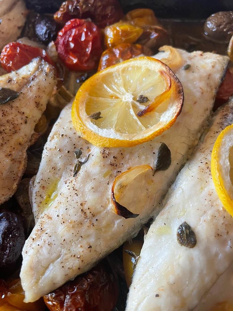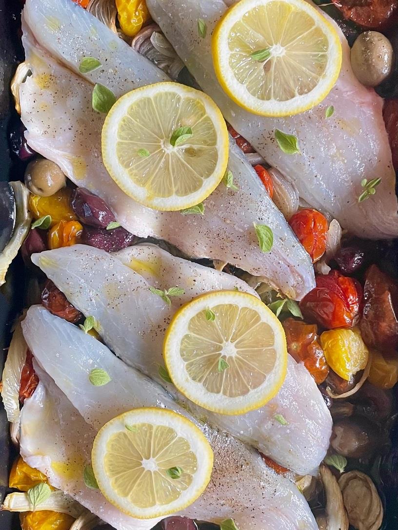 Βγάζουμε το ταψί από τον φούρνο, χαμηλώνουμε την θερμοκρασία στους 180ο C, αφαιρούμε το σκόρδο, προσθέτουμε λίγες ελιές της αρεσκείας μας (ένα ή περισσότερα είδη), ανακατεύουμε απαλά και πάνω από τα λαχανικά αραδιάζουμε 4 φιλέτα ψαριού που έχουμε αλατοπιπερώσει. Περιχύνουμε με ένα ποτηράκι λευκό ξηρό κρασί, τον χυμό από μισό λεμόνι, ραντίζουμε με λίγο ακόμη ελαιόλαδο και πάνω από κάθε φιλέτο ψαριού τοποθετούμε μία λεπτή φέτα λεμονιού. Ξαναφουρνίζουμε και ψήνουμε για ακόμη 15’-20’ μέχρι να ψηθεί το ψάρι και να καψαλιστούν οι φέτες του λεμονιού. Ίσως να χρειαστεί και λίγος χρόνος παραπάνω αν τα φιλέτα είναι χοντρά αλλά, σε κάθε περίπτωση, προσέχουμε για να μην στεγνώσουν. Μια-δυο φορές κατά τη διάρκεια του ψησίματος περιχύνουμε το ψάρι με τα ζουμιά. Μοιράζουμε στα πιάτα, περιχύνουμε με τη σάλτσα, πασπαλίζουμε με λίγα ακόμη φυλλαράκια του βοτάνου που χρησιμοποιήσαμε και απολαμβάνουμε.