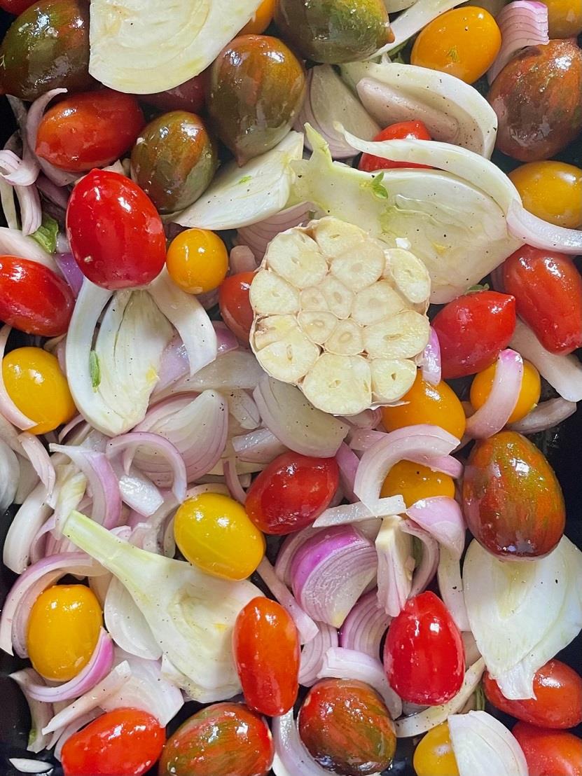 Προθερμαίνουμε τον φούρνο στους 200ο C. Σε ένα ταψί αραδιάζουμε 500 γρ. ολόκληρα ντοματίνια, 2 μεγάλα ξερά κρεμμύδια κομμένα σε φέτες, 1 μεγάλο φινόκιο κομμένο σε φέτες και μισό κεφάλι σκόρδο. Αλατοπιπερώνουμε, προσθέτουμε κλαράκια φρέσκιας ρίγανης ή κάποιου άλλου φρέσκου βοτάνου όπως θυμάρι, λεμονοθύμαρο ή δενδρολίβανο, ραντίζουμε με εξαιρετικό παρθένο ελαιόλαδο, ανακατεύουμε καλά και ψήνουμε για περίπου 20’ μέχρι να αρχίσουν να «σκάνε» τα ντοματίνια και να μελώνουν τα κρεμμύδια.