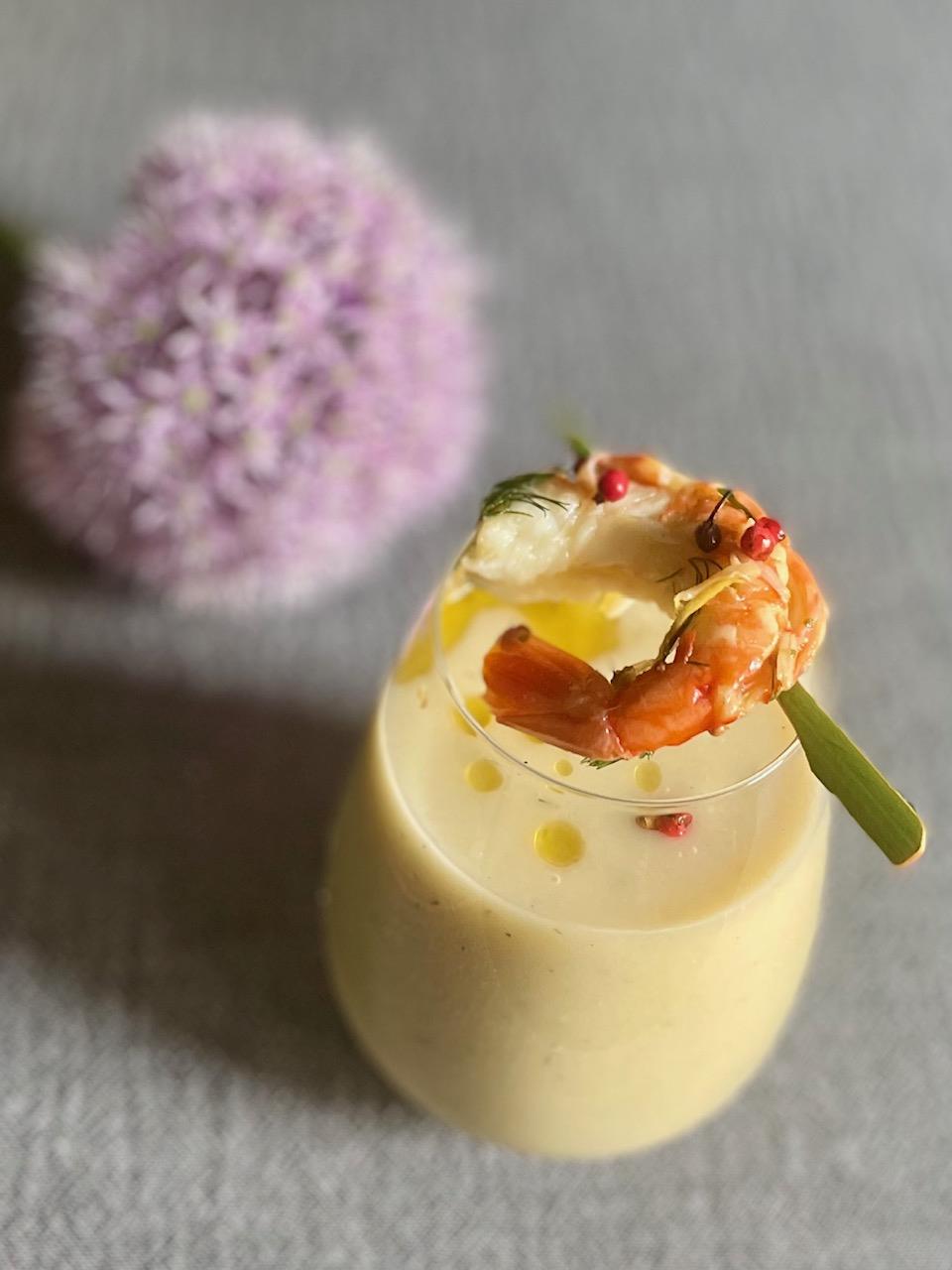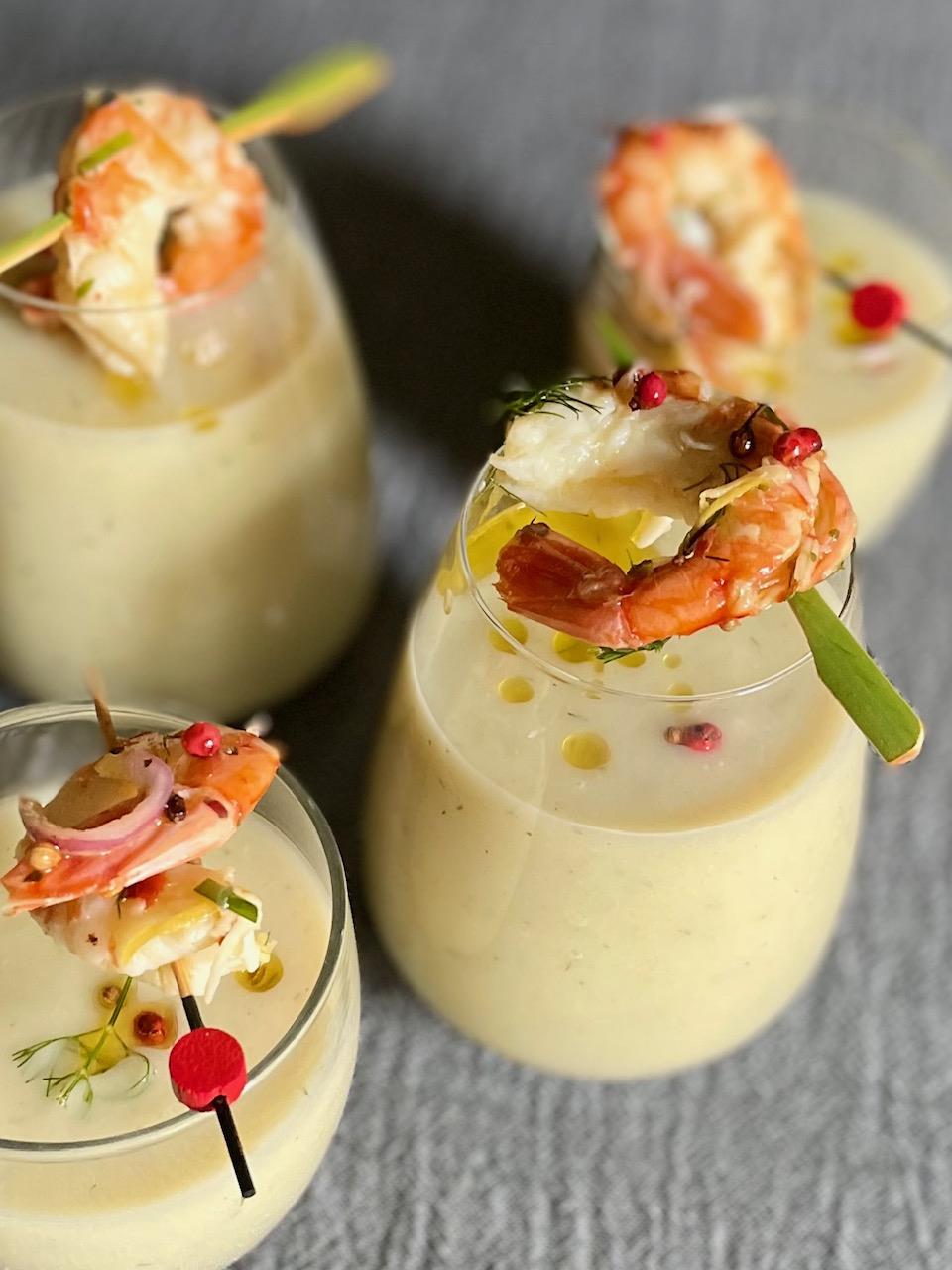 Καθαρίζουμε 6 αγκινάρες και κρατάμε τις καρδιές και το τρυφερό μέρος των κοτσανιών. Κόβουμε τις καρδιές στα τέσσερα και τις βαπτίζουμε σε μπολ με νερό και λεμόνια για να μην μαυρίσουν. Καθαρίζουμε και κόβουμε 1 μεγάλη πατάτα σε κομμάτια, 1 μεγάλο πράσο σε ροδέλες και ένα κομμάτι φρέσκο ginger ίσο με το μεγάλο μας δάχτυλο, κομμένο σε λεπτές φέτες. Σε μία κατσαρόλα με χοντρό πάτο ζεσταίνουμε σε μέτρια φωτιά 50 γρ. αγελαδινό βούτυρο και αχνίζουμε τα λαχανικά ανακατεύοντας και προσέχοντας να μην πάρουν χρώμα. Αλατοπιπερώνουμε και σκεπάζουμε με σπιτικό ζωμό λαχανικών ή με νερό. Σιγοβράζουμε μέχρι να μαλακώσουν τα λαχανικά. Στο τέλος του μαγειρέματος προσθέτουμε ψιλοκομμένο άνηθο ή μάραθο. Πολτοποιούμε, προσθέτουμε λίγο χυμό λεμονιού κατά βούληση και διορθώνουμε, αν χρειαστεί, το αλατοπίπερο. Μοιράζουμε τη σούπα σε μπολ ή σε ποτήρια και γαρνίρουμε με μία ή δύο γαρίδες. Αν κάνει ψύχρα όπως σήμερα θα απολαύσουμε τη σούπα ζεστή αλλά όχι καυτή. Όταν με το καλό φτιάξει ο καιρός, αμήν και πότε, θα την χαρούμε κρύα αλλά όχι παγωμένη.