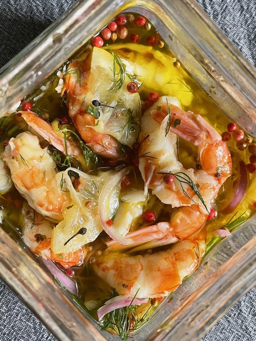 Ιδανικά τις φτιάχνουμε μία ή δύο ημέρες πριν για να αρωματιστούν από τα υλικά της μαρινάδας. Είτε έχουμε φρέσκες γαρίδες είτε κατεψυγμένες, τις βράζουμε πάντα με τα κελύφη και τα κεφάλια και μετά τις καθαρίζουμε. Αποφεύγουμε να αγοράσουμε καθαρισμένες και προβρασμένες γαρίδες γιατί είναι παντελώς άγευστες, ενώ η υφή τους δεν είναι καθόλου ελκυστική. Εάν είναι κατεψυγμένες δεν χρειάζονται απόψυξη. Αφού τις βράσουμε για λίγα λεπτά σε αλατισμένο νερό μέχρι ίσα να αλλάξουν χρώμα (προσοχή να μην παραβράσουν γιατί γίνονται σκληρές), τις αφήνουμε να κρυώσουν και αφαιρούμε τα κεφάλια και τα κελύφη αφήνοντας προαιρετικά την ουρά (οι λόγοι είναι περισσότερο αισθητικής παρά ουσίας). Mε μια οδοντογλυφίδα απομακρύνουμε το έντερο κατά μήκος της ράχης τους. Τις βάζουμε σε μπολ και προσθέτουμε τα υλικά της μαρινάδας: κόκκους διαφόρων ειδών πιπεριού, σπόρους κόλιανδρου ή μάραθου ή και από τους δύο ελαφρά κοπανισμένους, κάτι καυτερό όπως μπούκοβο ή φρέσκες πιπερίτσες chili, ξερό κρεμμύδι κομμένο σε πολύ λεπτά μισοφέγγαρα, σκόρδο και φρέσκο ginger κομμένα σε πολύ λεπτά μπαστουνάκια σαν σπίρτα, ξύσμα, χυμό και πολύ λεπτοκομμένες φέτες λεμονιού και ένα ή δύο φρέσκα βότανα όπως μάραθο, άνηθο, σχινόπρασο, κόλιανδρο. Ανακατεύουμε, βάζουμε σε βάζο και καλύπτουμε με εξαιρετικό παρθένο ελαιόλαδο. Διατηρούνται στο ψυγείο 4-5 μέρες.