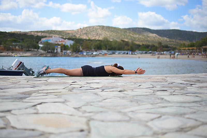 Ξαπλώνουμε σε πρηνή θέση και με τα χέρια στην ευθεία των ώμων. Ανασηκώνουμε τον κορμό ελαφρά από το πάτωμα τραβώντας τα χέρια προς τα πίσω λυγισμένα.