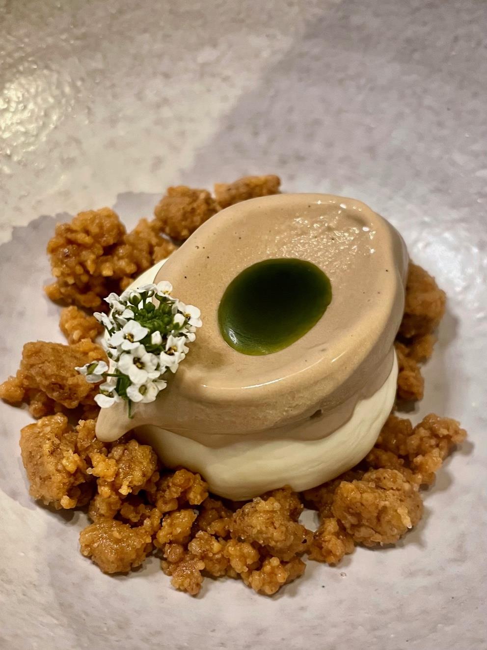 Από τα επιδόρπια που είναι δημιουργίες της pastry chef Καλλιόπης Μαρού με προϋπηρεσία στο ξενοδοχείο Ποσειδώνιο των Σπετσών, το παγωτό από μαύρο σκόρδο που συνδυάζεται με παστέλι, λάδι φρέσκου κόλιανδρου και γιαούρτι (€ 10) με είχε τσιγκλίσει από την στιγμή που το διάβασα, πριν καν αρχίσουμε το δείπνο. Επειδή αδυνατώ να σας περιγράψω με ακρίβεια αυτό που γεύτηκα και, κυρίως, επειδή θα είναι μάλλον λίγο δύσκολο να σας πείσω για το πόσο αρμονικός και νόστιμος είναι αυτός ο αναπάντεχος συνδυασμός, σας παρακινώ να το τολμήσετε.