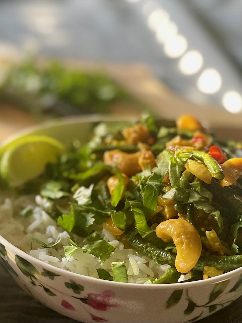 Σερβίρουμε σε μπολ με ψιλοκομμένο φρέσκο κόλιανδρο ή/και βασιλικό, μία φέτα μοσχολέμονο (lime) και συνοδεύουμε με ρύζι basmati ή jasmine.