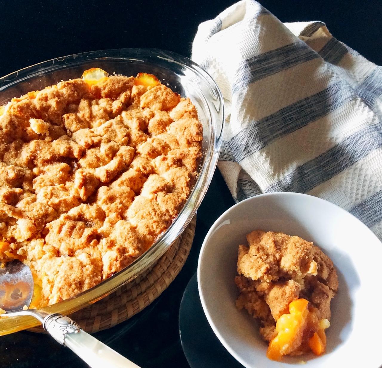Σε ένα μπολ ανακατεύουμε ½ φλ. τσ. λευκή ή καστανή ζάχαρη με λεπτοτριμμένο ξύσμα από 1 μεγάλο λεμόνι. Ανακατεύουμε για λίγα λεπτά μέχρι να μοσχομυρίσει η ζάχαρη από το λεμόνι. Προσθέτουμε 6 φλ. τσ. βερίκοκα κομμένα στα 4 ή σε περισσότερα κομμάτια εάν είναι μεγάλα, ½ φλ. τσ. αλεύρι για όλες τις χρήσεις, 1 κ.σ. corn flour και ¼ κ.γλ. αλάτι. Ανακατεύουμε απαλά και βάζουμε σε ένα ελαφρώς βουτυρωμένο πυρίμαχο σκεύος. Σε ένα μπολ βάζουμε 1 φλ. τσ. αλεύρι για όλες τις χρήσεις, 1 ½ κ.γλ. baking powder, 6 κ.σ. καστανή ζάχαρη, ½ κ.γλ. κανέλα ή σπόρους από ½ λοβό βανίλιας και 1 πρέζα αλάτι. Προσθέτουμε 85 γρ. παγωμένο βούτυρο κομμένο σε μικρούς κύβους και με τα ακροδάχτυλά μας δουλεύουμε τα υλικά, μέχρι το βούτυρο να “σπάσει” σε μικρά μπαλάκια στο μέγεθος του μπιζελιού και το μίγμα να μοιάζει με χοντρά ψίχουλα. Φροντίζουμε να δουλέψουμε γρήγορα, πριν προλάβει να λιώσει το βούτυρο, κυρίως εάν κάνει πολλή ζέστη. Τέλος, προσθέτουμε ¼ φλ. τσ. βραστό νερό και ανακατεύουμε ίσα ίσα μέχρι να απορροφηθεί, χωρίς να πολυπαιδέψουμε τη ζύμη γιατί σε αυτό το γλυκό δεν την θέλουμε ομοιογενή. Τοποθετούμε κομματάκια ζύμης στην επιφάνεια των φρούτων με κενά ανάμεσά τους. Πασπαλίζουμε με λίγη καστανή ζάχαρη και ψήνουμε σε προθερμασμένο φούρνο στη λειτουργία του αέρα στους 180ο C για περίπου 45΄. Μετά το πρώτο εικοσάλεπτο σκεπάζουμε με αλουμινόχαρτο το οποίο αφαιρούμε τα τελευταία 5΄, για να ροδοκοκκινίσει η επιφάνεια. Σερβίρουμε χλιαρό ή σε θερμοκρασία δωματίου.
