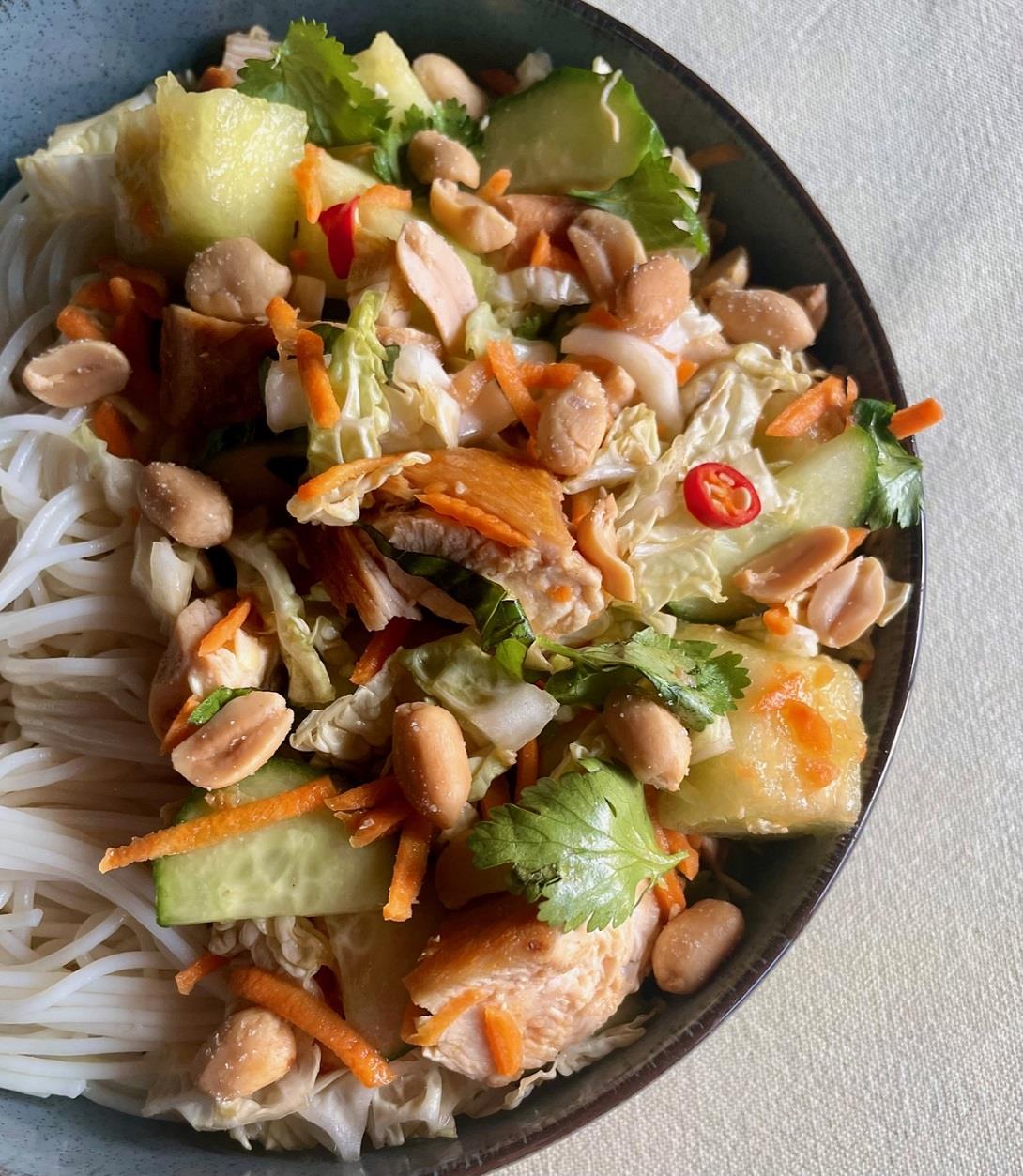Σαλάτα: Κόβουμε μισό πεπόνι σε κύβους, 2 μικρά ή 1 μεγάλο αγγούρι σε λεπτές φέτες και μισό κινέζικο λάχανο σε λεπτές λωρίδες. Τρίβουμε 2 μέτρια καρότα. Ρολάρουμε 5-6 μεγάλα φύλλα φρέσκου βασιλικού και τα κόβουμε σε λεπτές λωρίδες. Βγάζουμε τα φυλλαράκια από μισό μάτσο φρέσκου κόλιανδρου (αν δεν μας αρέσει αντικαθιστούμε με ψιλοκομμένα φύλλα δυόσμου ή αυξάνουμε την ποσότητα του βασιλικού). Ψιλοκόβουμε 1-2 φρέσκες πιπερίτσες chili (με ή χωρίς τα σπόρια, αναλόγως του πόσο μας αρέσουν τα καυτερά). Βάζουμε το πεπόνι, τα σαλατικά και τα μυρωδικά σε μπολ, το ίδιο και το κοτόπουλο. Ετοιμάζουμε το dressing ανακατεύοντας τον χυμό από 2 μοσχολέμονα (limes), 1 γεμάτο κ.γλ. ginger σε σκόνη (ή ένα μικρό κομμάτι νωπού ginger ψιλοτριμμένο), 1 κ.σ. soy sauce, 1 κ.γλ. fish sauce (αν δεν έχουμε αυξάνουμε λίγο την ποσότητα της soy sauce), 1 κ.σ. mirin (αν δεν έχουμε αντικαθιστούμε με μηλόξυδο) και 1 κ.γλ. sesame oil. Προσθέτουμε το dressing στο μπολ με το κοτόπουλο και τα υπόλοιπα υλικά, ανακατεύουμε και αφήνουμε για να αναμιχθούν τα αρώματα μέχρι να ετοιμάσουμε τα noodles.