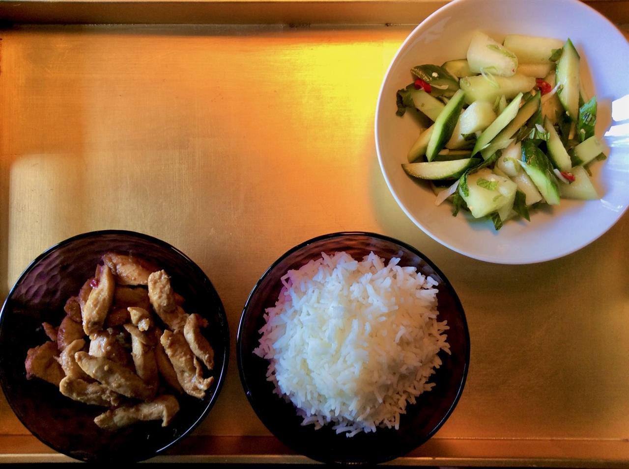 Σαλάτα: Κόβουμε μισό πεπόνι σε κύβους (μπορούμε να αναμίξουμε πεπόνι και ανανά) και 2 μικρά ή 1 μεγάλο αγγούρι σε λωρίδες, ½ ξερό κρεμμύδι σε πολύ μικρούς κύβους, 2 φρέσκα κρεμμυδάκια σε λεπτές διαγώνιες φέτες και 1 μπαστουνάκι ginger σε πολύ λεπτές λωρίδες σαν σπίρτα. Προσθέτουμε πιπερίτσες chili κατά βούληση (με ή χωρίς τα σπόρια, αναλόγως του πόσο μας αρέσουν τα καυτερά), ξύσμα και χυμό από 1 μοσχολέμονο και μπόλικο ψιλοκομμένο δυόσμο ή βασιλικό. Βάζουμε τα υλικά σε μπολ, το ίδιο και το κοτόπουλο, προσθέτουμε το dressing και αφήνουμε για να αναμιχθούν τα αρώματα μέχρι να ετοιμάσουμε το ρύζι.