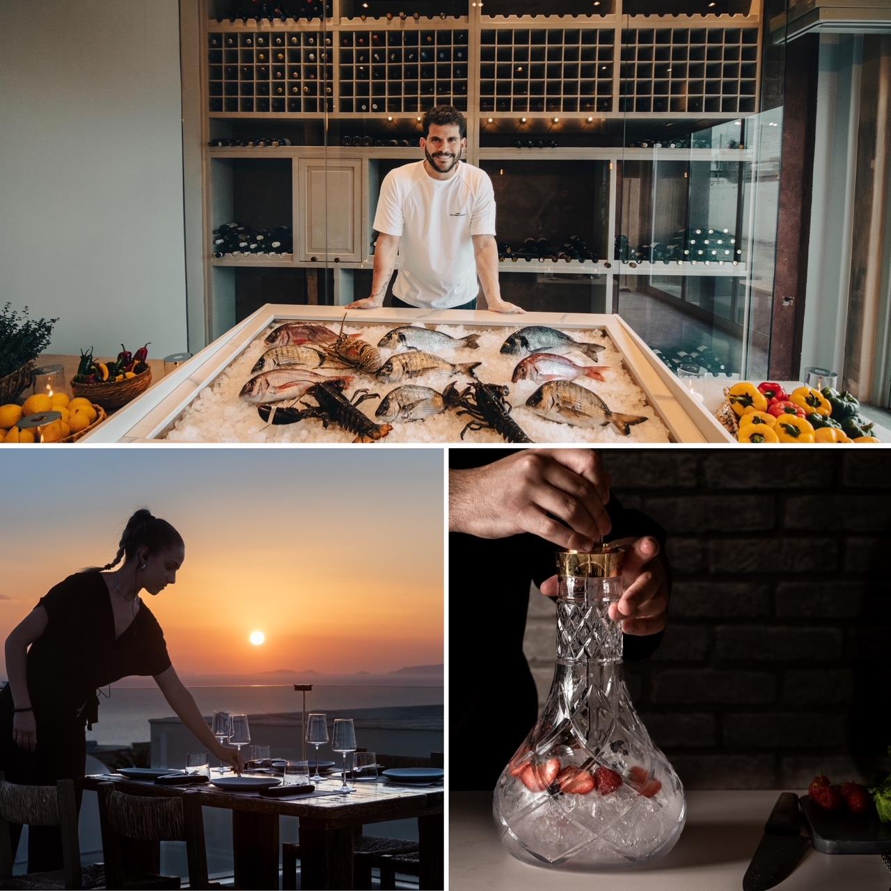 Σε ένα τραπέζι με θέα το αιώνια σαγηνευτικό ηλιοβασίλεμα της Σαντορίνης, σε απόσταση αναπνοής από την άγρια ομορφιά της Καλντέρας, θα απολαύσετε δροσιστικά κοκτέιλ, εξαιρετικά κρασιά και το νέο μενού του Λευτέρη Καρέλη ο οποίος, έχοντας μαζέψει γνώσεις και εμπειρίες στην Ελλάδα και στο εξωτερικό, συνδέει στα πιάτα του γεύσεις του χθες και του σήμερα, της Ελλάδας και του κόσμου, με ό,τι καλύτερο έχει να προσφέρει ο τόπος και η εποχή.