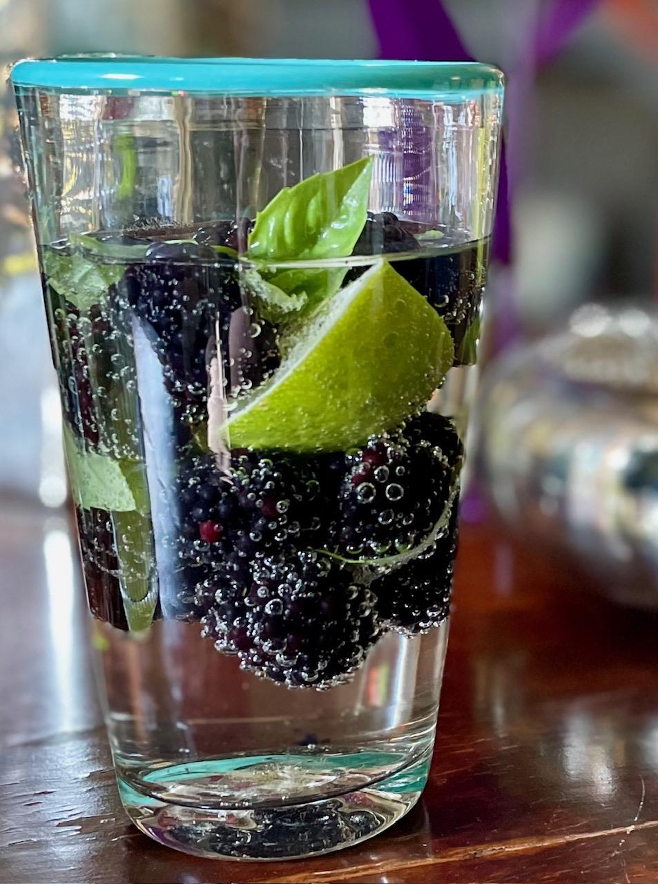 Βατόμουρα, χοντρές φέτες lime, βασιλικός, ανθρακούχο νερό.