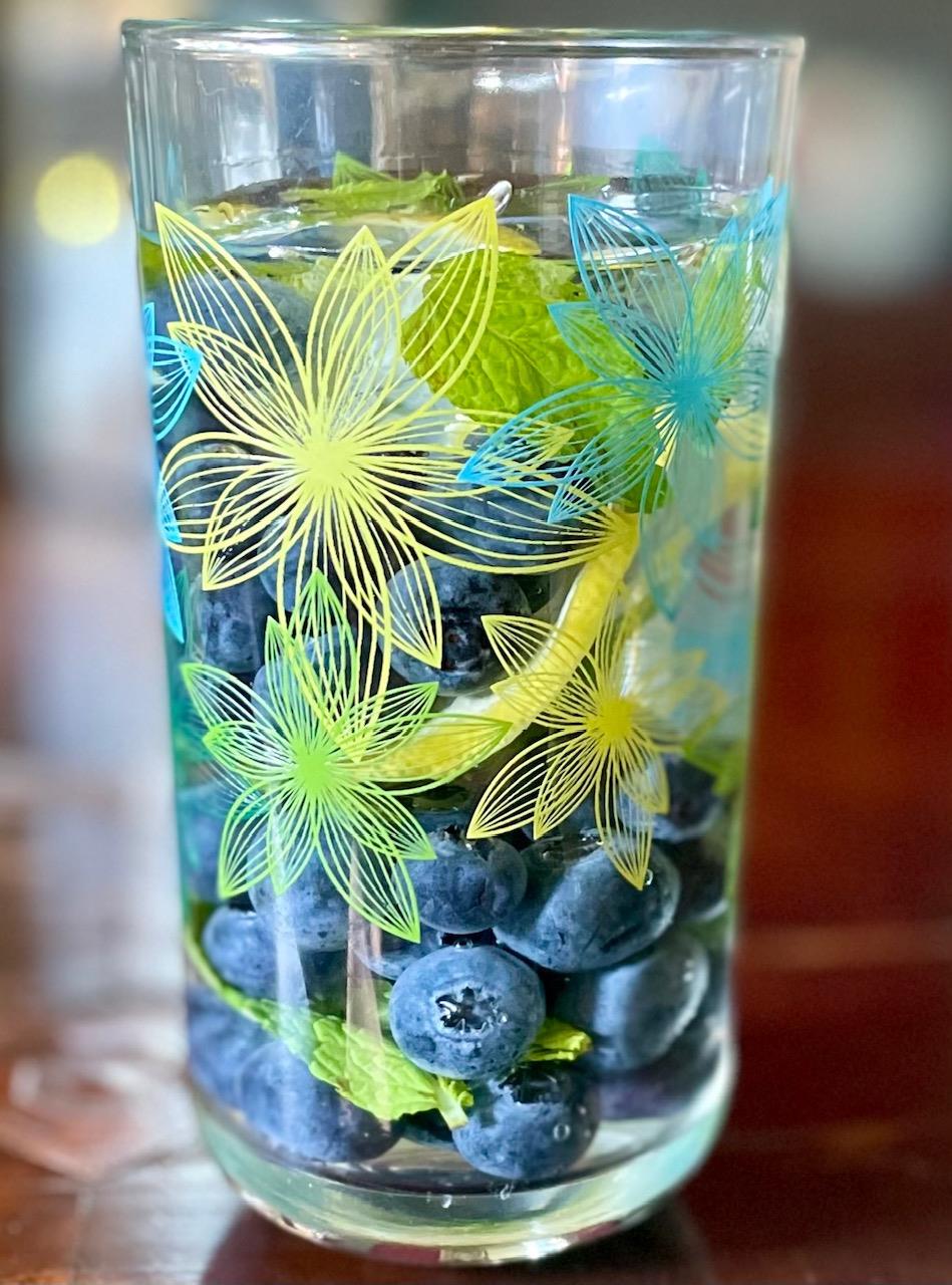 Μύρτιλα, φέτες λεμονιού, μέντα ή δυόσμος. Νερό ήπιο ή ανθρακούχο.