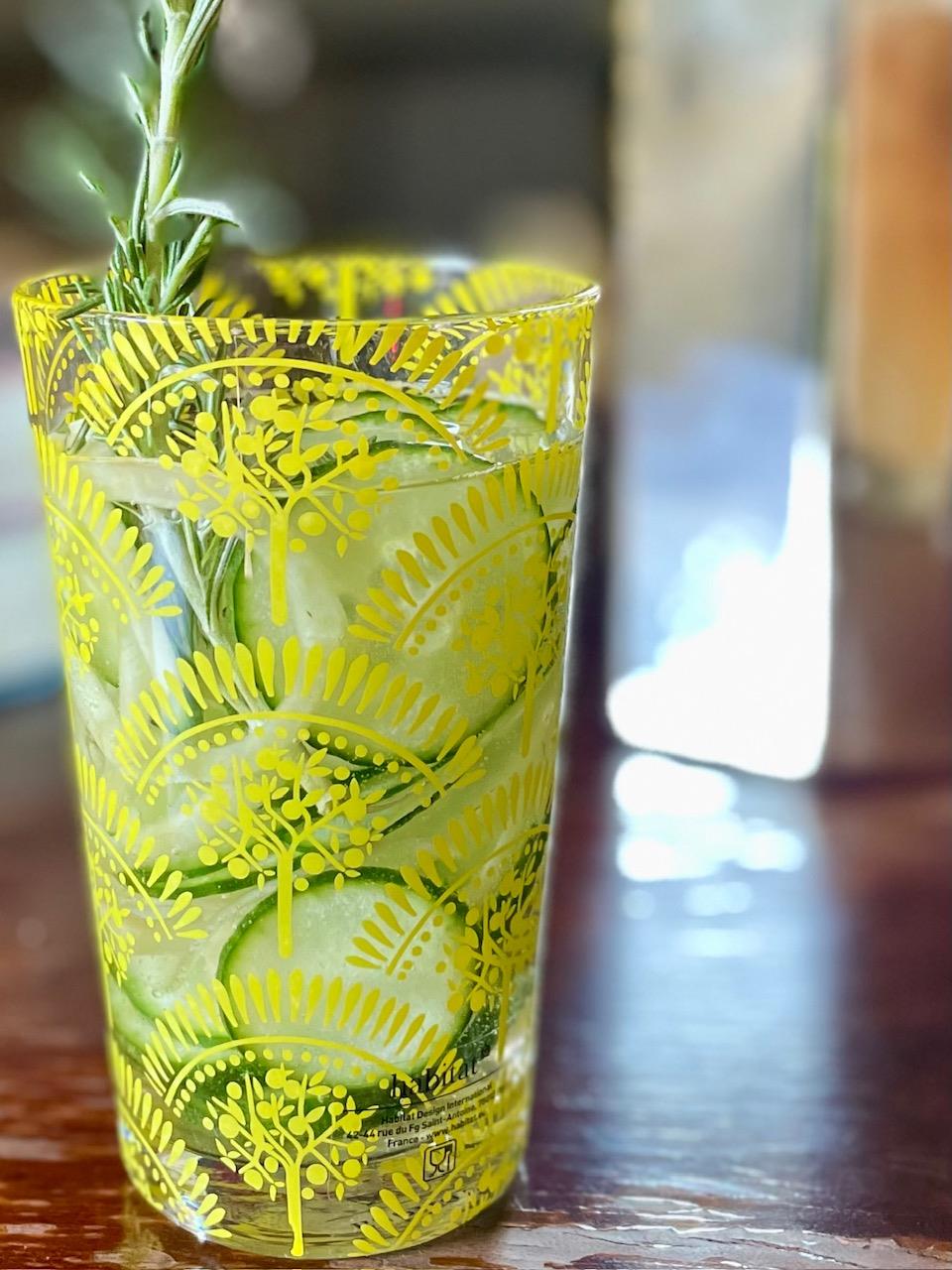 Λεπτές φέτες από αγγούρι και μαραθόριζα, δενδρολίβανο και προαιρετικά λίγες σταγόνες λεμονιού ή lime. Νερό ήπιο ή ανθρακούχο