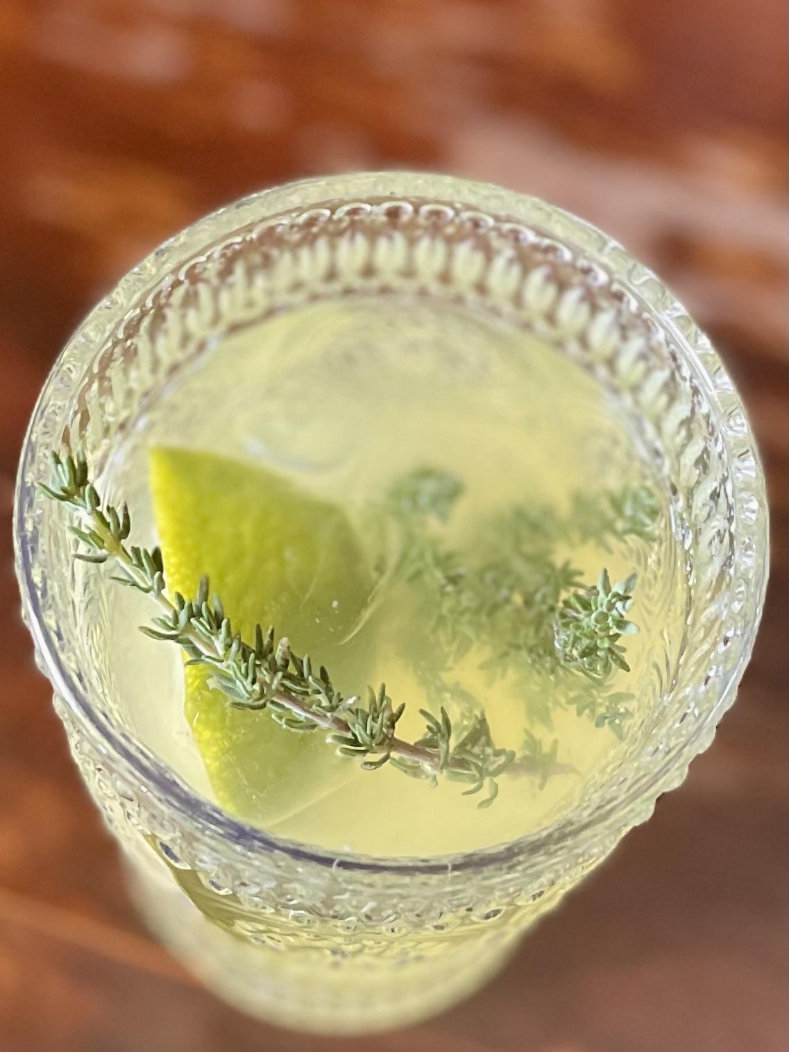 Πολτοποιημένο και σουρωμένο πεπόνι, ήπιο νερό και ελαφρύ σιρόπι με ginger, lime, θυμάρι και λίγη ζάχαρη.