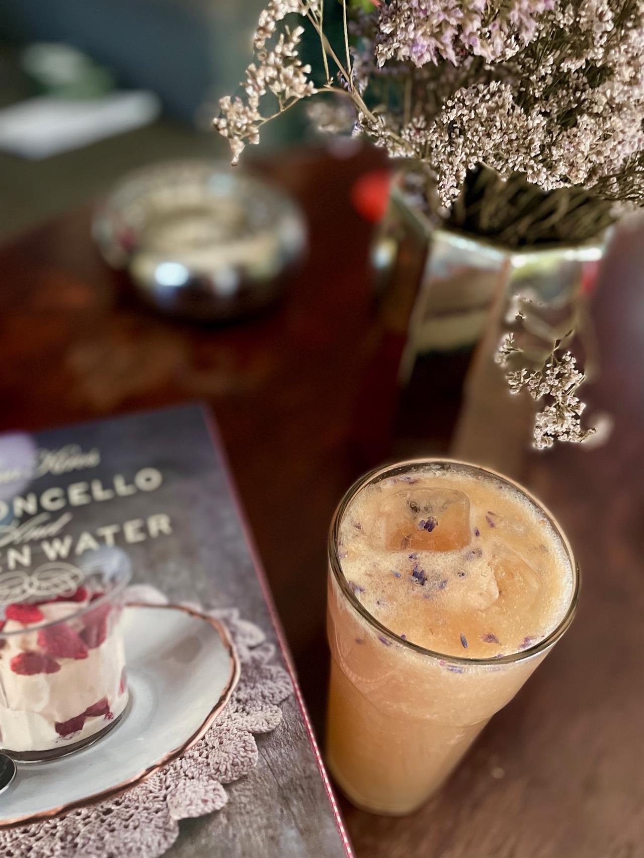 Πολτοποιημένα λευκόσαρκα ροδάκινα μη σουρωμένα, αραιωμένα με ανθρακούχο νερό και ελαφρύ σιρόπι με λεβάντα, σταγόνες λεμονιού και λίγο μέλι.