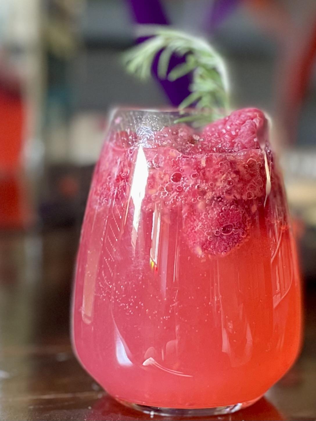Στον πάτο πολτοποιημένα σμέουρα, pink grapefruit soda, ολόκληρα σμέουρα και δενδρολίβανο.