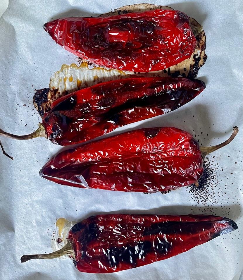 Ψήνουμε 4 κόκκινες πιπεριές Φλωρίνης στη λαμαρίνα του φούρνου στρωμένη με λαδόκολλα σε πολύ δυνατό φούρνο για περίπου 30’, μέχρις ότου καψαλιστούν από όλες τις πλευρές (τις γυρνάμε κατά διαστήματα). Όσο είναι ακόμη καυτές τις τοποθετούμε σε σακούλα τροφίμων την οποία σφραγίζουμε πολύ καλά και τις αφήνουμε μέχρι να κρυώσουν: οι υδρατμοί που μένουν εγκλωβισμένοι βοηθούν στο εύκολο ξεφλούδισμα (βλ. tips). Μόλις κρυώσουν τις ξεφλουδίζουμε, αφαιρούμε τα σπόρια και τις κόβουμε σε μεγαλούτσικους κύβους. Παράλληλα, ζεματάμε 2 μέτριες ντομάτες αφού τις χαράξουμε σταυρωτά στην βάση τους για ελάχιστα λεπτά, μέχρι να «σκάσει» η φλούδα τους. Αμέσως τις βαπτίζουμε σε πολύ παγωμένο νερό και μόλις κρυώσουν τις ξεφλουδίζουμε, αφαιρούμε τα σπόρια, κόβουμε τη σάρκα σε κύβους και τους βάζουμε σε σουρωτήρι για να απομακρύνουμε τα ζουμιά.