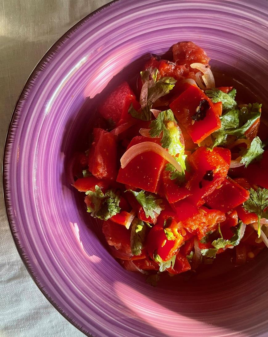 Σε αυτή τη σαλάτα αυτοσχεδίασα, έχοντας σαν βάση την Μαροκινή taktouka η οποία έχει αρκετό σκόρδο, κάτι που δεν ήθελα και αντ’ αυτού έβαλα λίγο κρεμμύδι. Τα κύρια υλικά της είναι οι ψητές κόκκινες πιπεριές, οι ντομάτες και τα μπαχαρικά και είναι λίγο πικάντικη από την πάστα καυτερής πιπεριάς που ονομάζεται harissa και η οποία είναι το πιο σύνηθες -και μάλλον το μοναδικό- καυτερό στοιχείο της κουζίνας του Μαρόκου και των υπόλοιπων χωρών της Βόρειας Αφρικής. Τη σαλάτα δροσίζει ο φρέσκος κόλιανδρος.